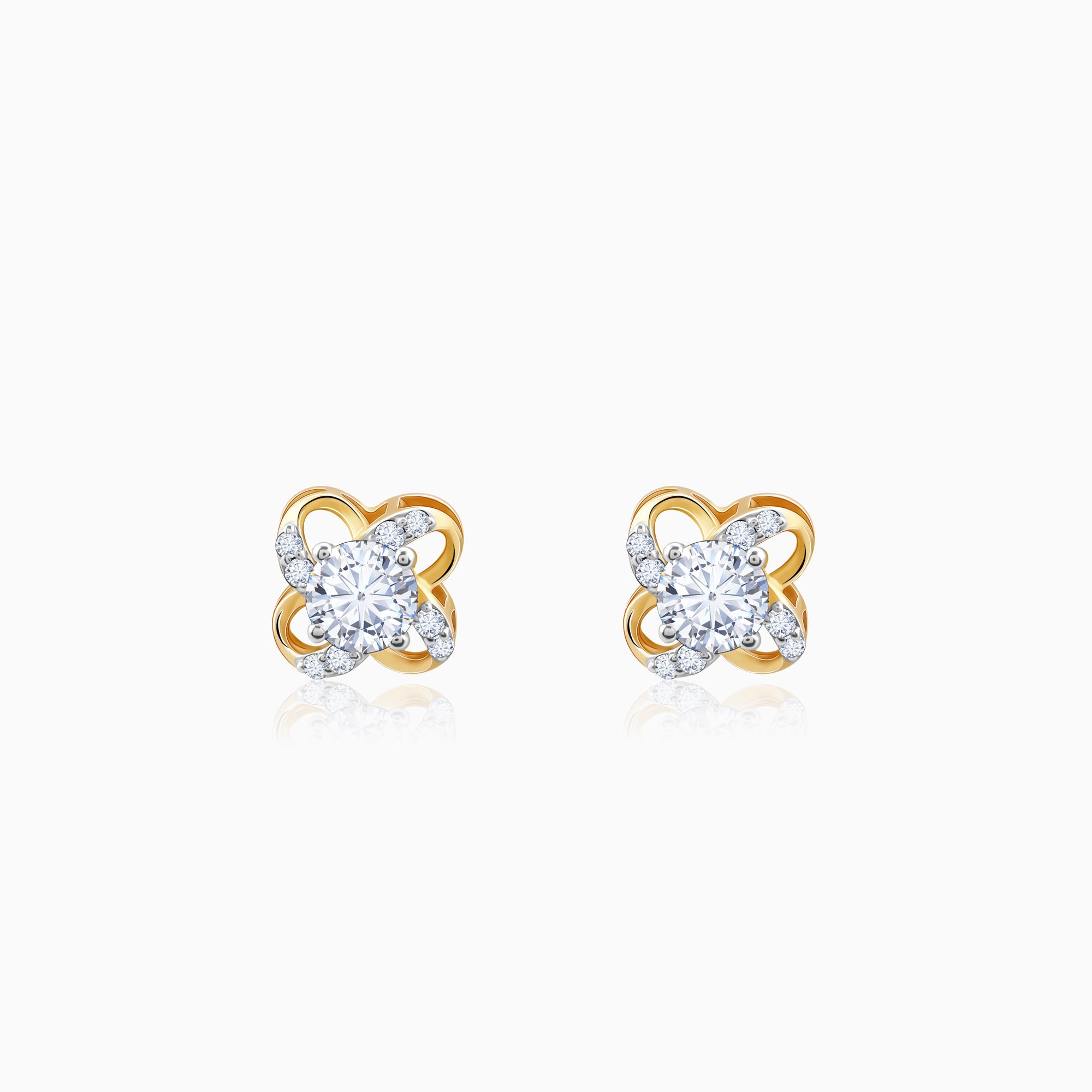 These pure gold earrings for women feature a four-petal floral design with lab grown diamonds studded along the edges. A raised solo diamond sits at the centre.