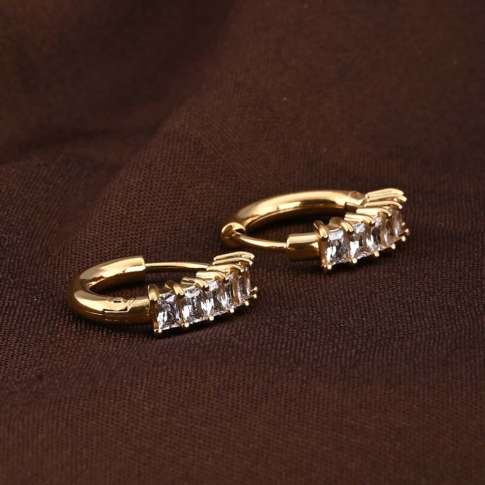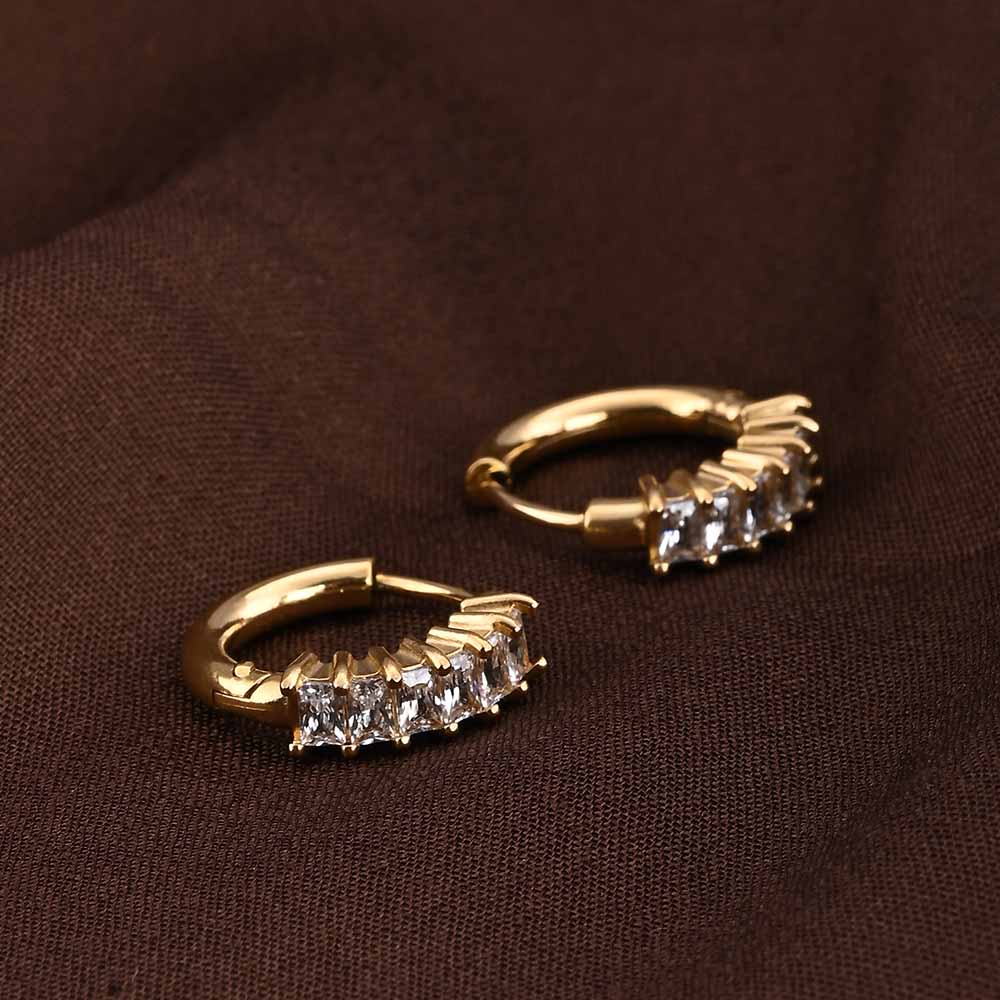 Sparkling and versatile, these 18k gold plated stone-studded hoop earrings feature dazzling white cubic zirconia for a subtle yet elegant shine. Perfect for both everyday glamour and evening sophistication, their waterproof and anti-tarnish finish ensures lasting radiance while adding a luxe touch to your jewellery collection.