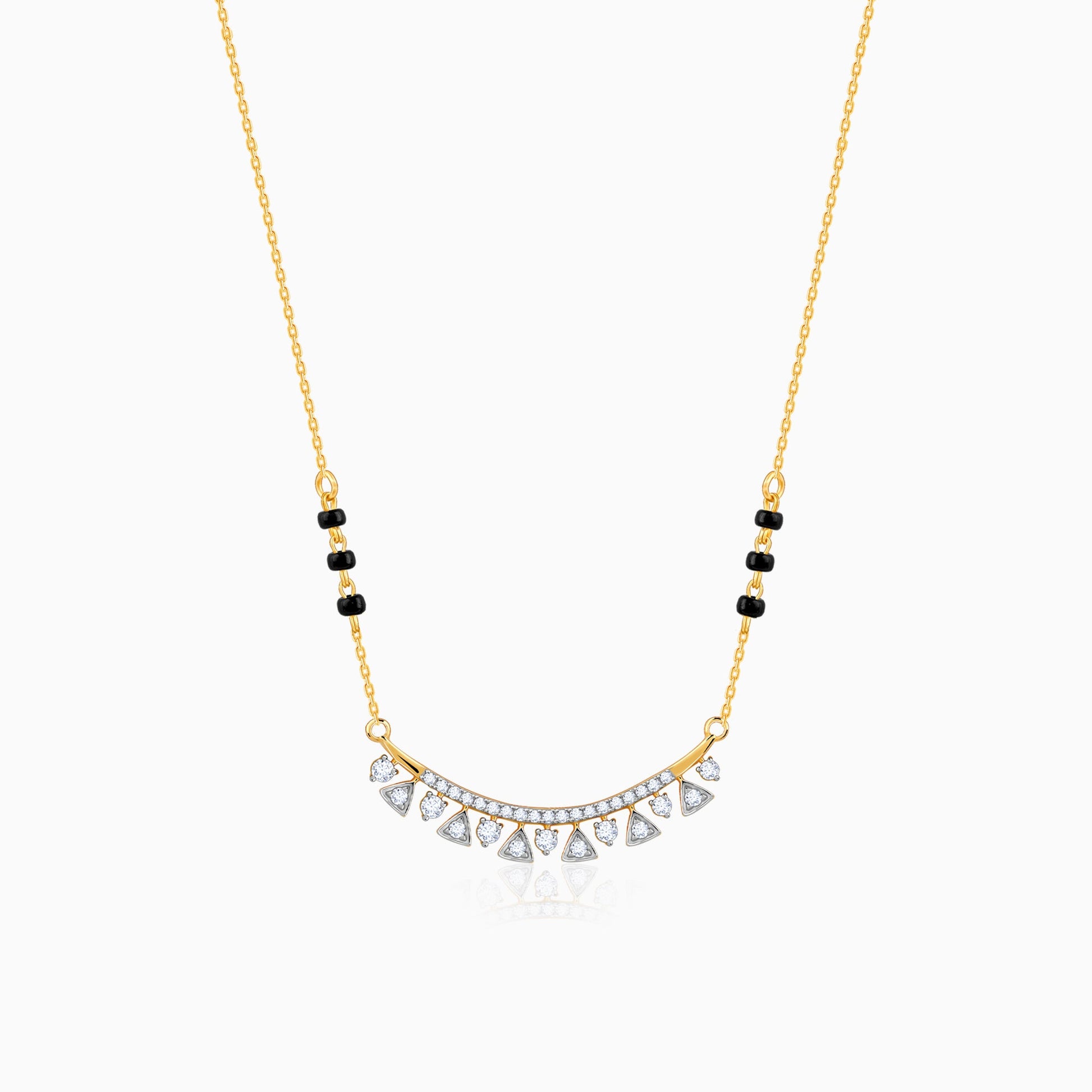 This pure gold mangalsutra for women features a curve with triangular & circiular motifs studded with lab grown diamonds. The gold chain, set with traditional black beads, adds a modern touch.