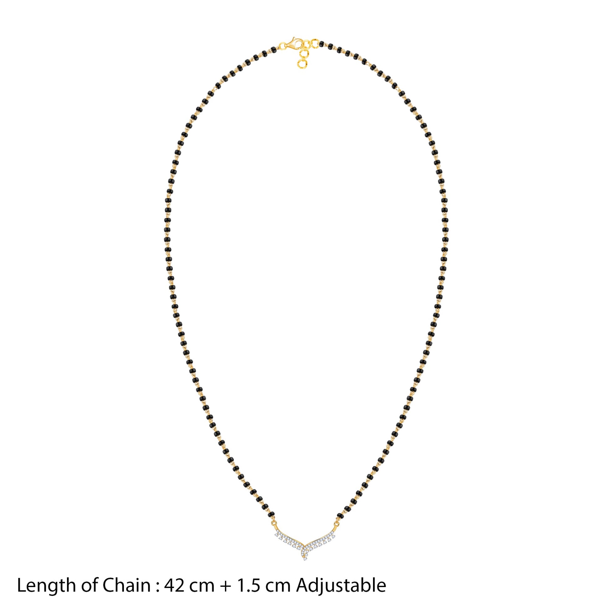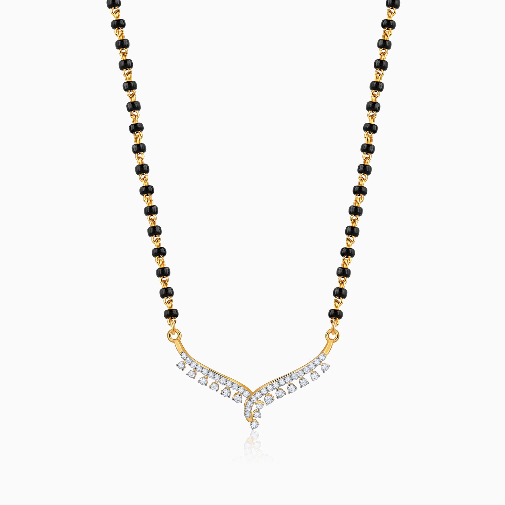 This gold mangalsutra for women features a chain with traditional black beads and a V-shaped design. Twin rows of lab grown diamonds and dangling accents add graceful movement and layered sparkle.