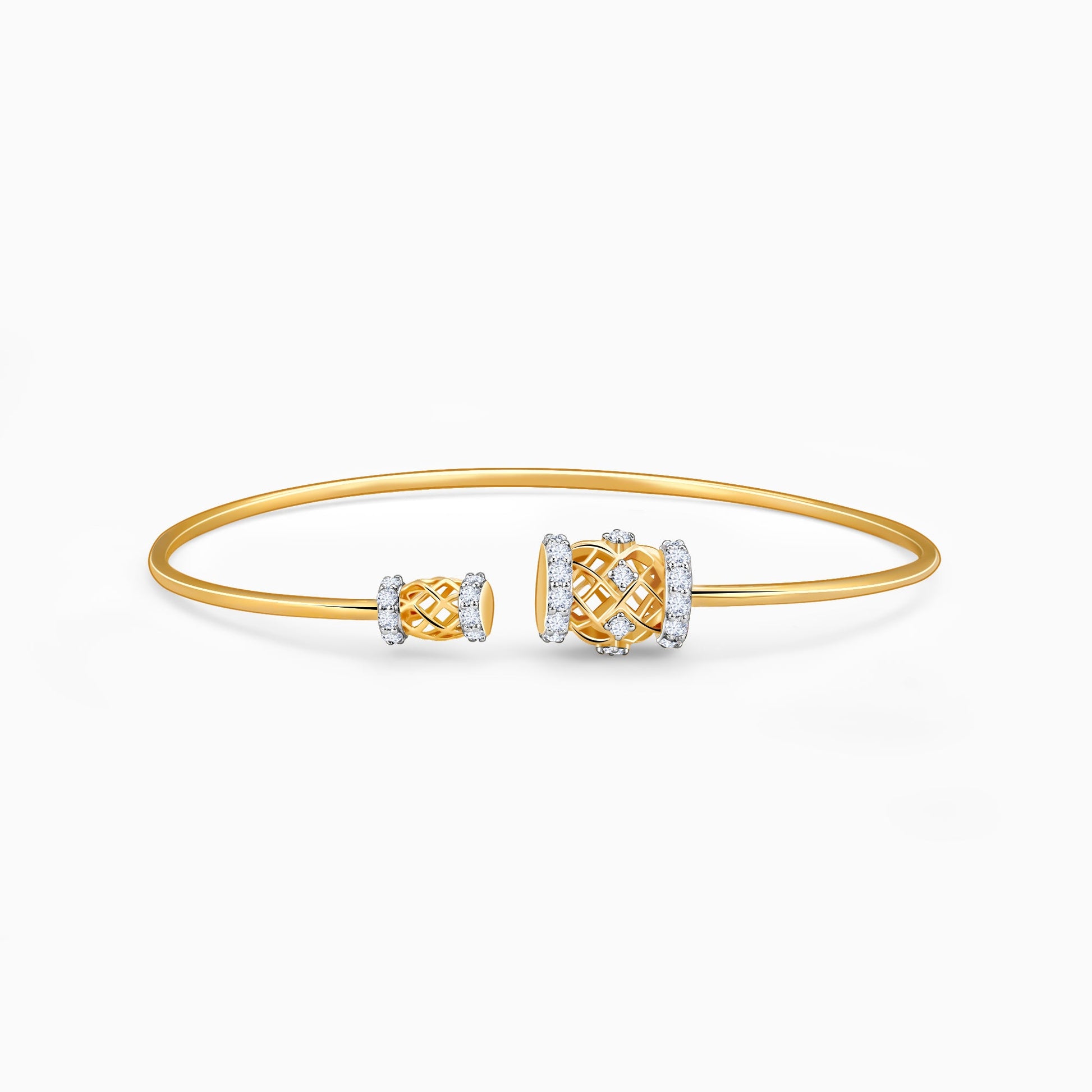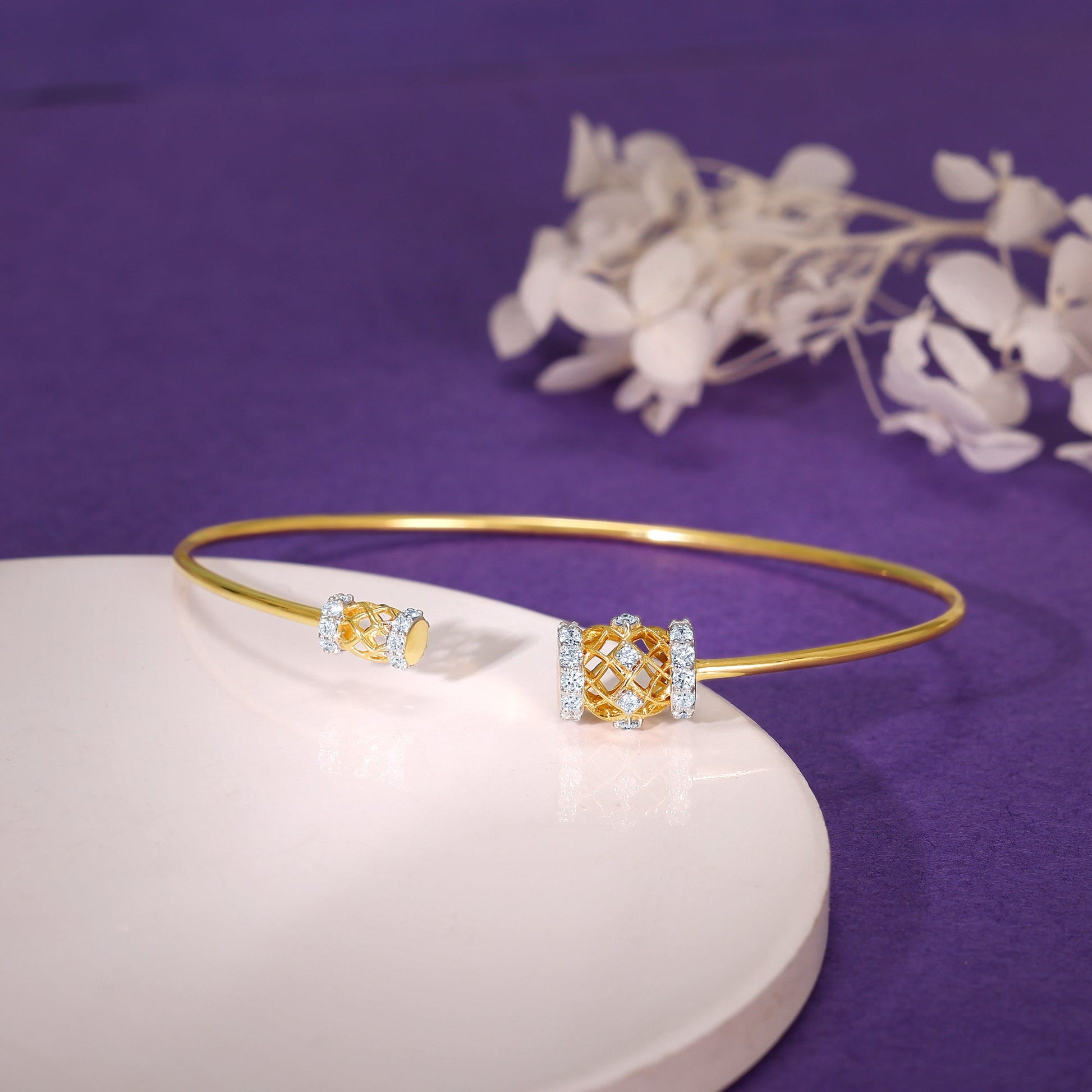 This pure gold cuff bracelet for women features an open design, with both ends embellished with cylinder motifs set with lab grown diamonds.