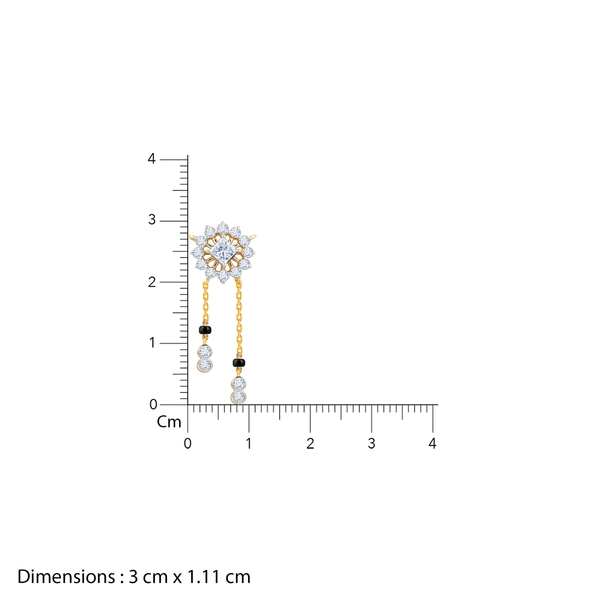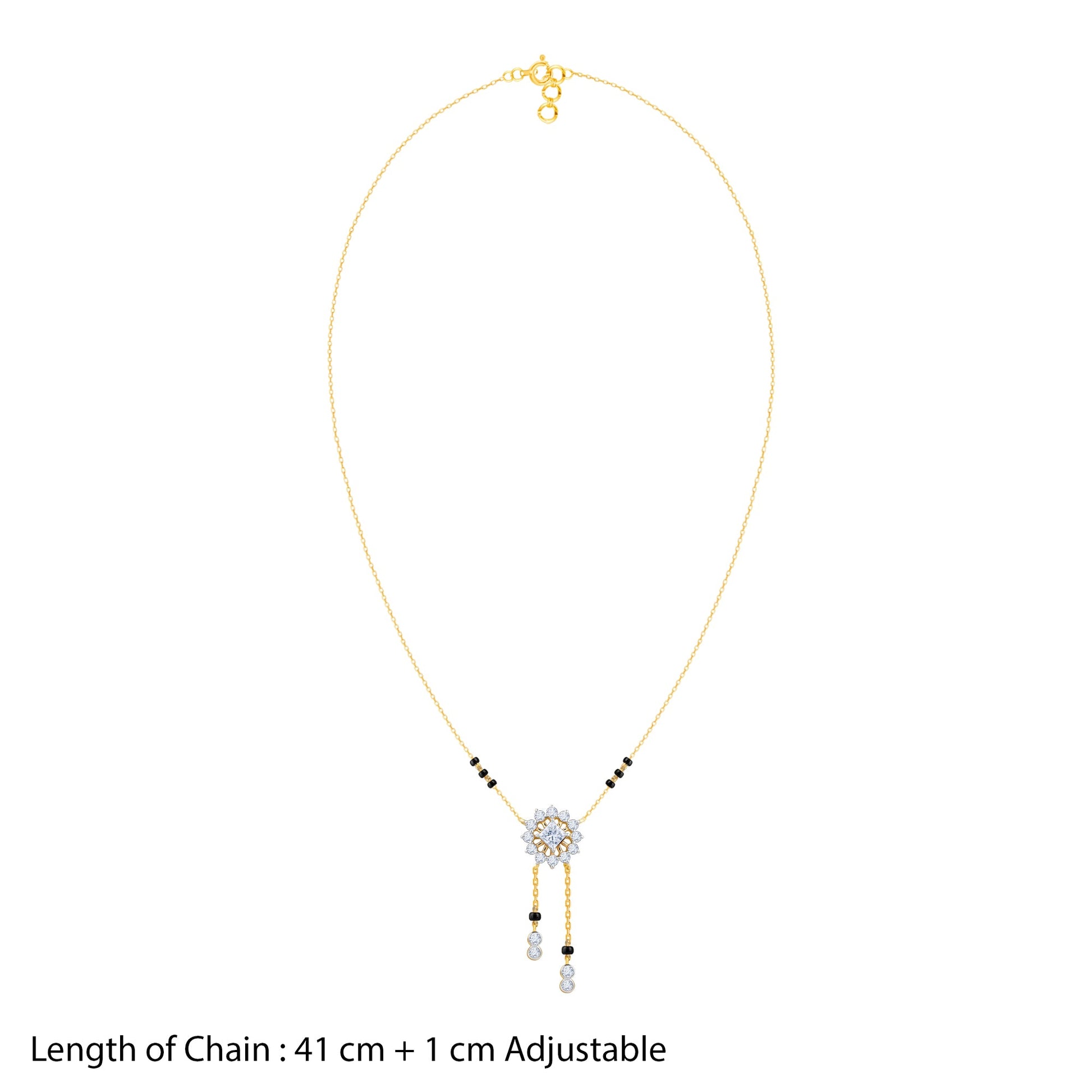 This pure gold mangalsutra for women features a floral motif studded with labgrown diamonds and black beads on both sides of the chain. Two lab diamonds and beads also dangle from the motif.