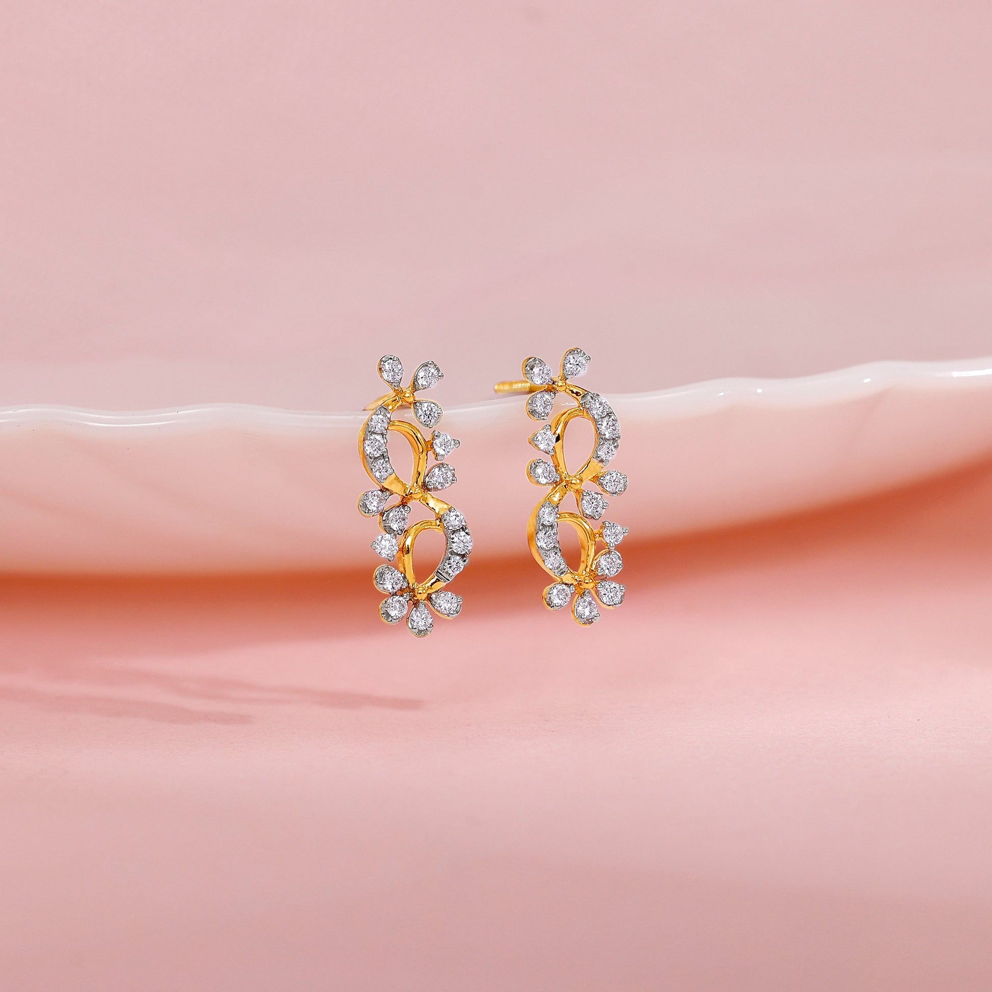 These pure gold earrings for women feature a unique floral motif studded with sparkling lab grown diamonds.