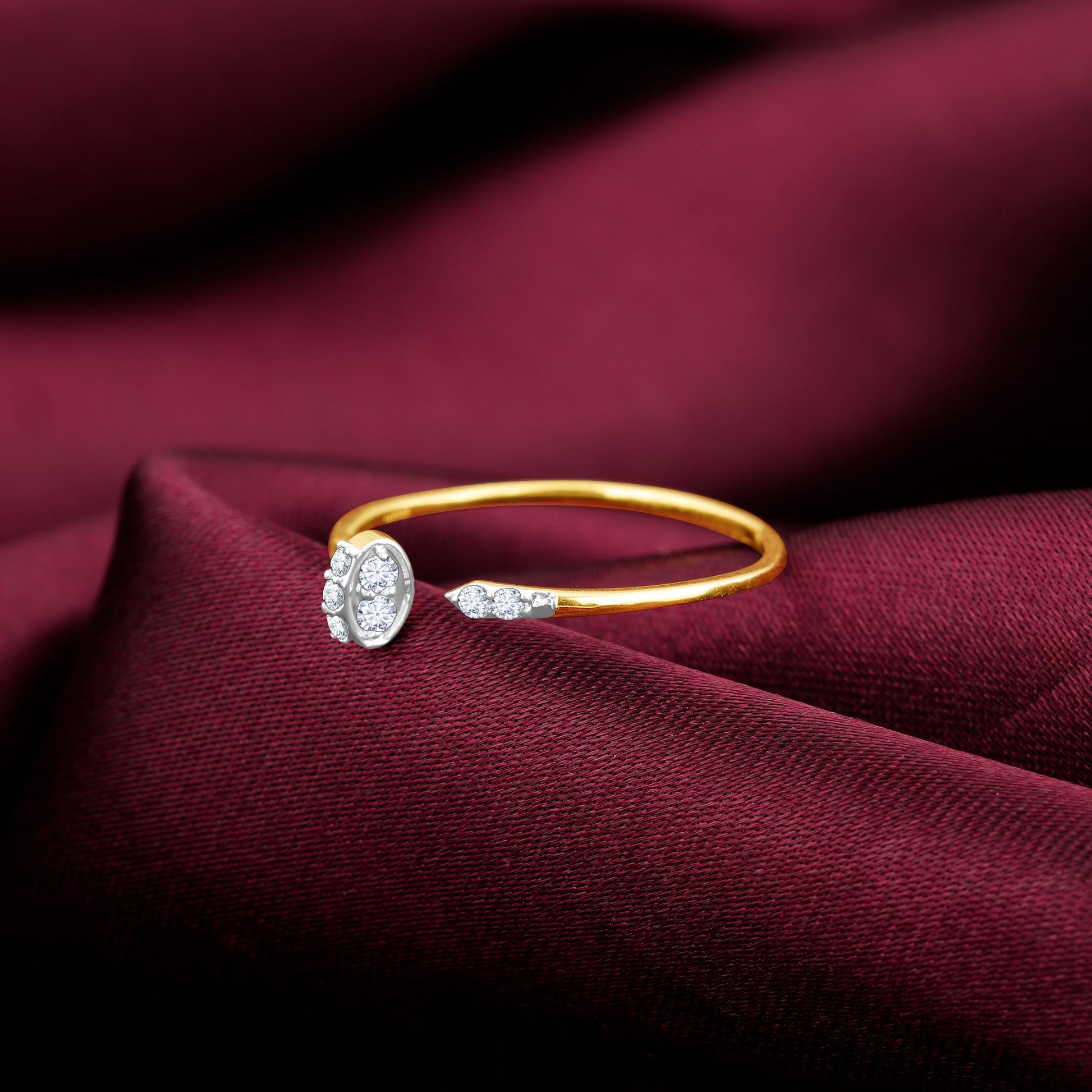 This gold open ring has a circle design on one end and a pointed edge on the other, featuring lab-grown diamonds.