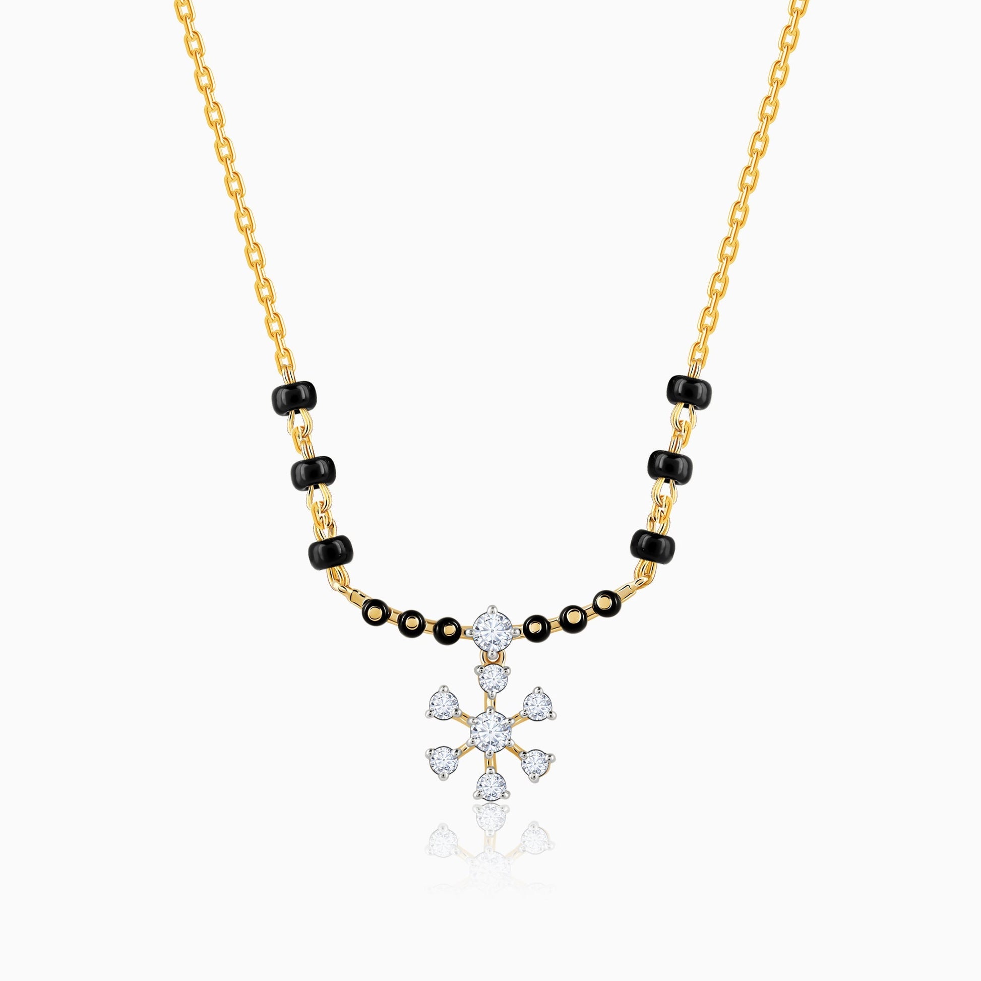 This pure gold mangalsutra features a modern, stylised floral pendant studded with lab-grown diamonds, complemented by traditional black beads along the band and gold chain.