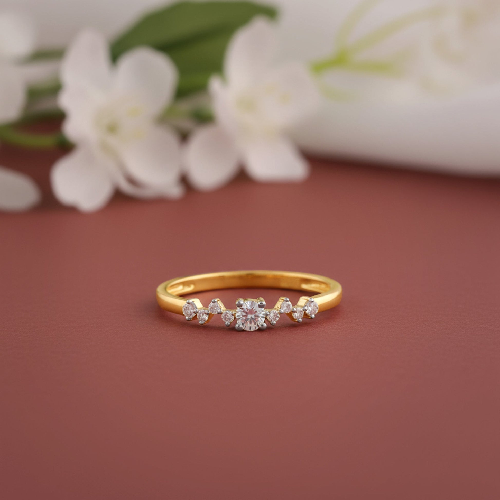 This gold ring features lab grown diamonds in a delicate prong setting along the band, crowned with a dazzling centre diamond. For the kind of woman who sparkles with grace and a touch of whimsy. Try the exquisite lab grown diamond jewellery from Heer By Trendy Freak today.