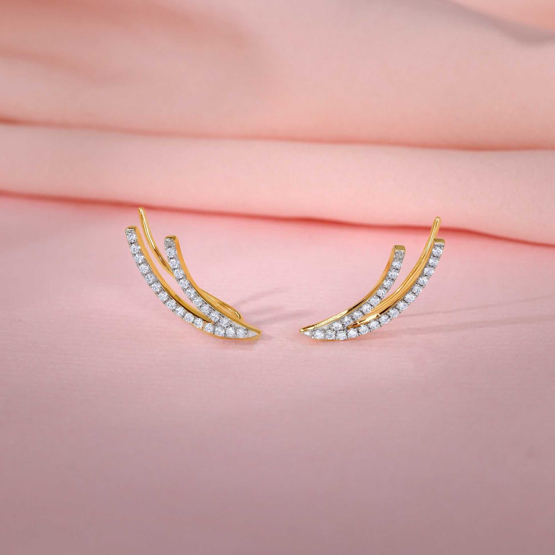 These pure gold earrings for women feature a dual-layer curve design studded with lab grown diamonds.