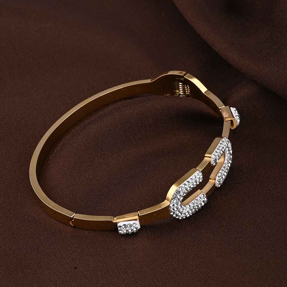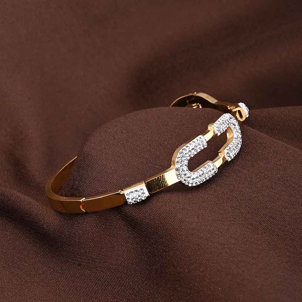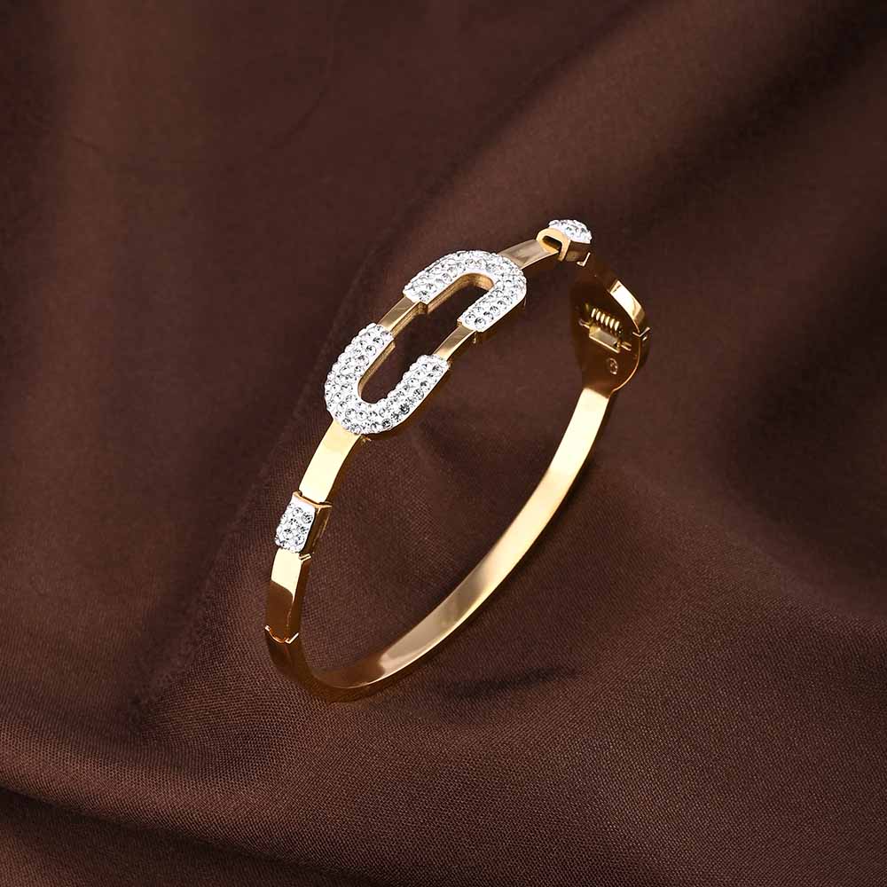 The Gold Zircon Studded Cuff Bracelet for women radiates elegance and modern sophistication. Crafted in 18k gold tone stainless steel, its sleek bangle design is adorned with sparkling white zirconia for a refined, luxurious shimmer. Waterproof and anti-tarnish, this versatile bracelet effortlessly elevates both casual and formal outfits, making it a must-have statement piece for women who appreciate timeless style with contemporary flair.