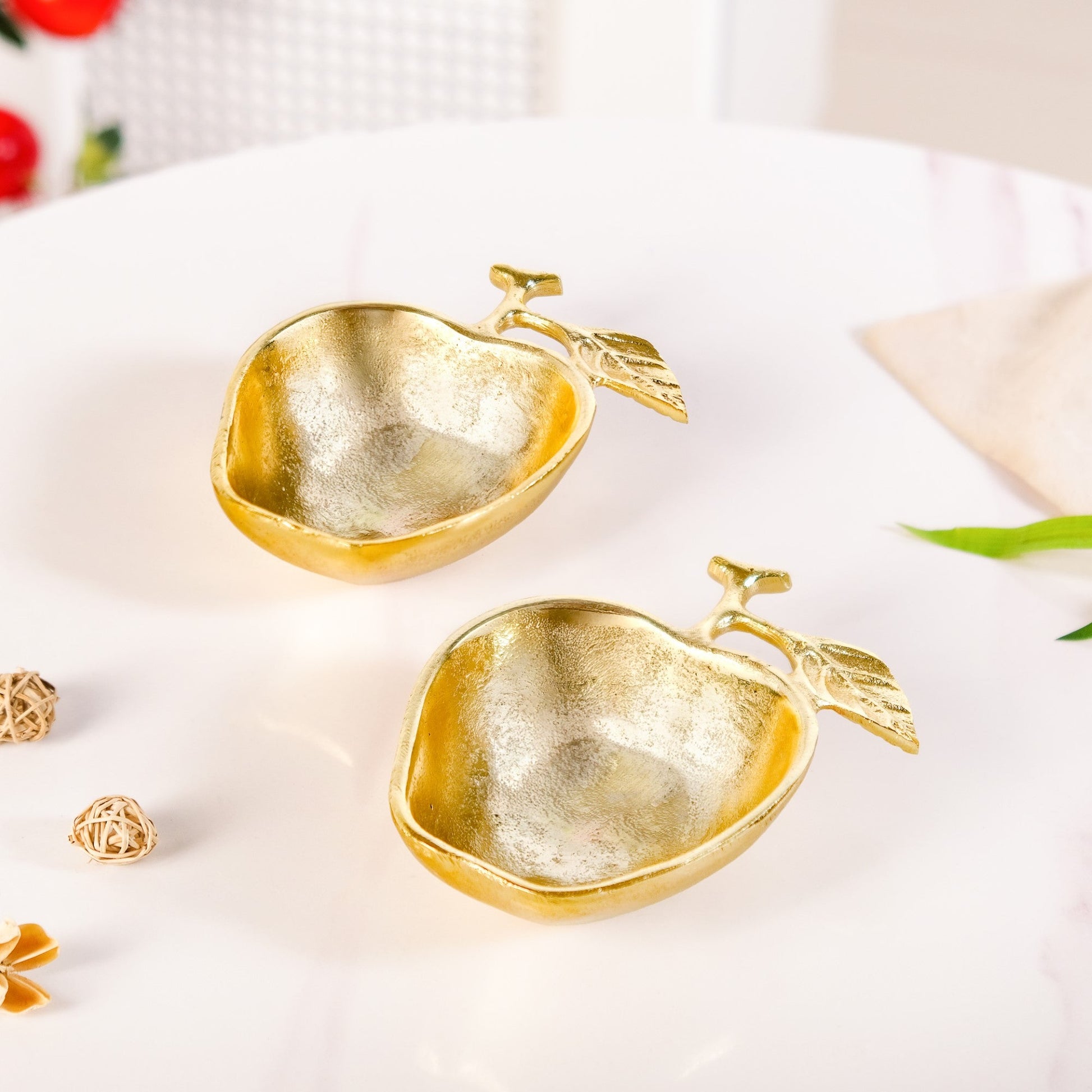 Design: Made with durable metal and designed with a gently curved form that mimics the natural contours of an apple, this trinket bowl set features a sculpted stem and a delicately detailed leaf for added visual interest. The bowl’s warm gold-toned finish and subtly textured surface give it a refined, artisanal feel, perfect for your decor. Compact yet eye-catching, it’s ideal for holding jewellery, keys, or other small essentials while adding a hint of luxury to your vanity.
