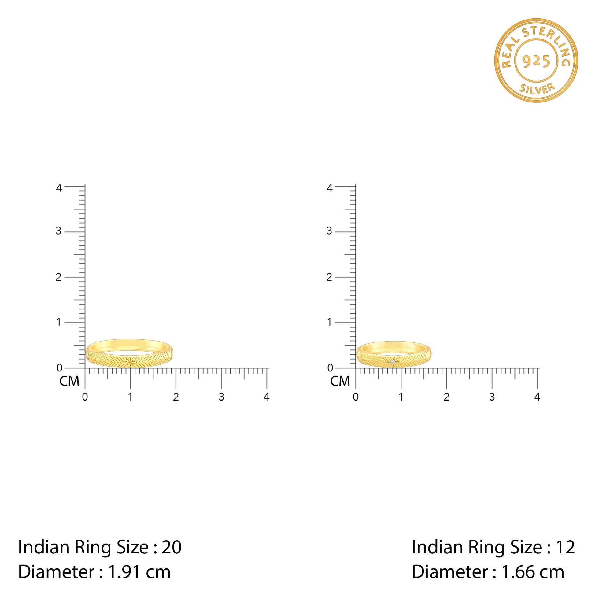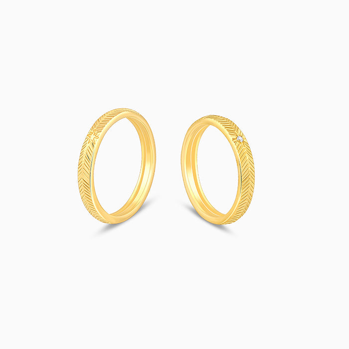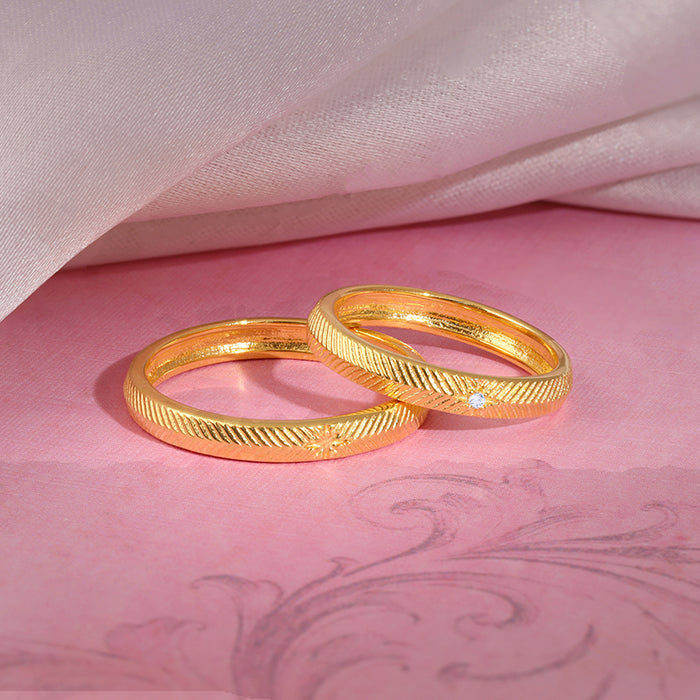 These gold plated couple band features a tire mark pattern. One ring is accented with a single clear stone, while the other showcases a star-shaped engraving.