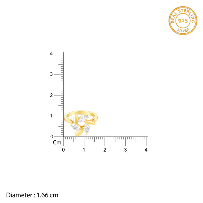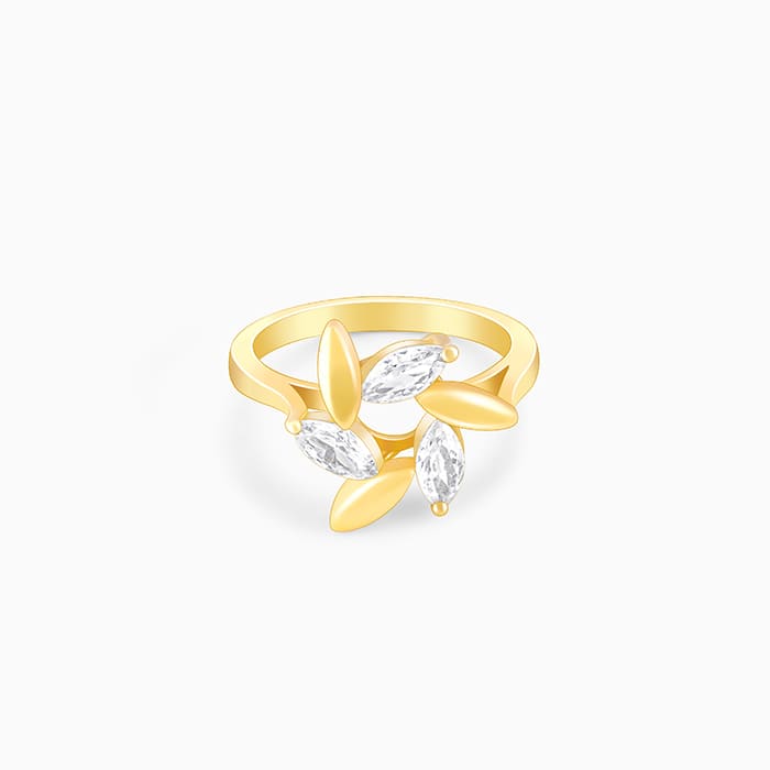This golden ring has a leaf pattern arranged in a wreath design, alternately studded with marquise-cut zircons in the middle.