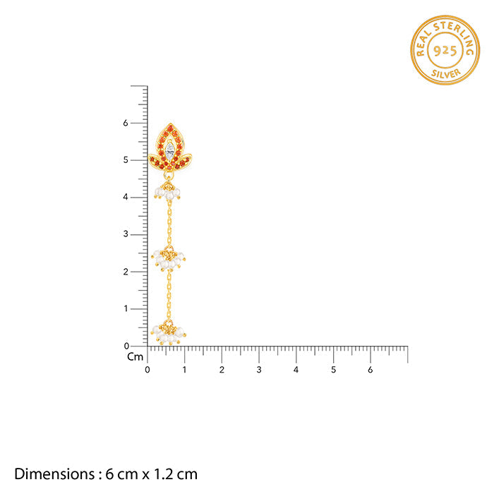 These gold plated dangler earrings for women showcases a flower motif studded with colourful zircons, and a zircon at its centre. A chain hangs below, accented with a cluster of pearls. Designed in Italy. Inspired by India. Embrace the goddess within with the Shakti Collection by Trendy Freak x Anna Giulia Chicco.