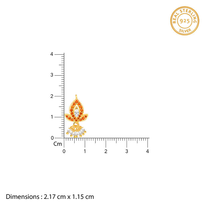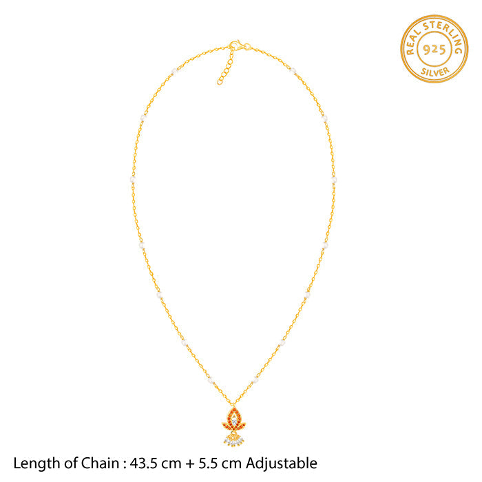 This gold plated necklace for women showcases a flower motif studded with colourful zircons, and a zircon at its centre. Pearls elegantly dangle below, complemented by additional pearls on the chain. Designed in Italy. Inspired by India. Embrace the goddess within with the Shakti Collection by Trendy Freak x Anna Giulia Chicco.