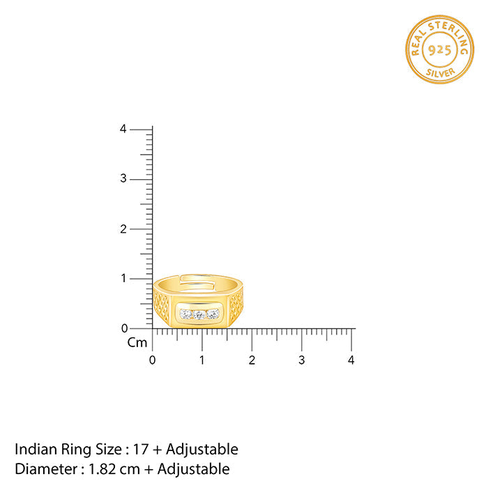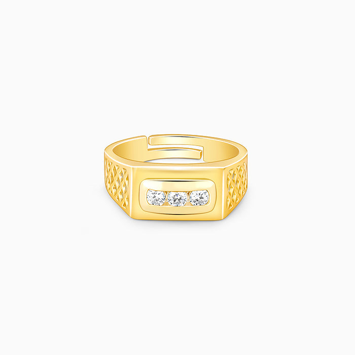 This gold plated ring for men features an intricate-patterned rectangular motif of zircons, in the centre and a studded band.