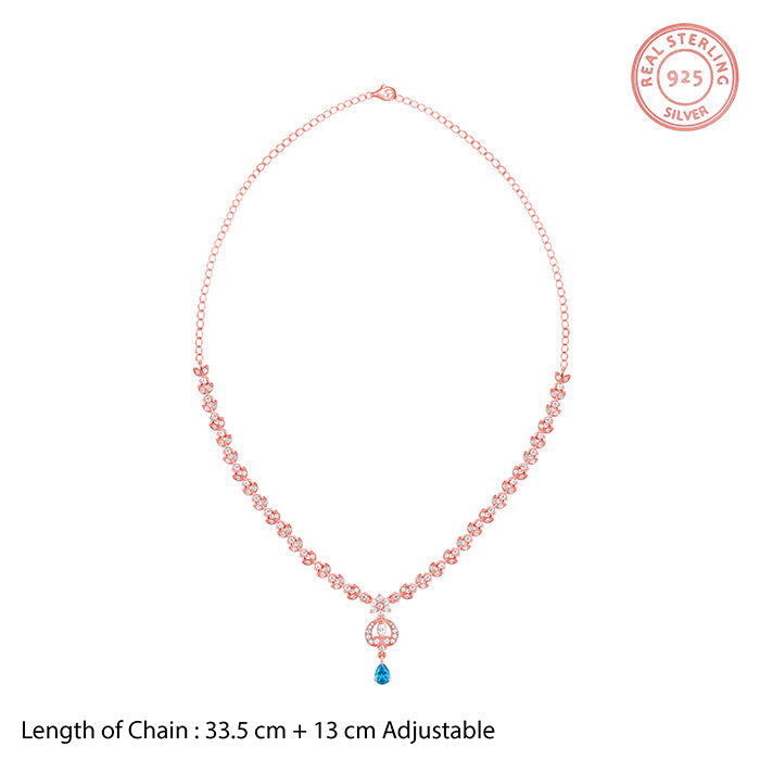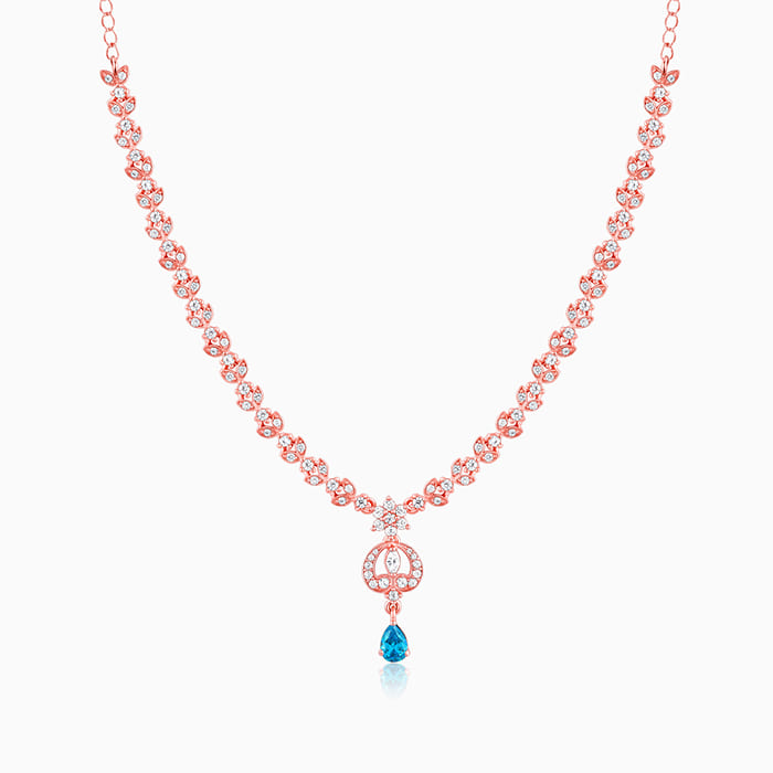 This golden necklace features a heart motif at its centre, with a pear drop shaped blue coloured stone dangling and the chain has intricate leaf motifs studded with zircons.