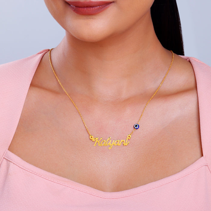 This personalised gold-plated evil eye charm necklace features a personalised name of your choice and an evil eye motif on the chain.