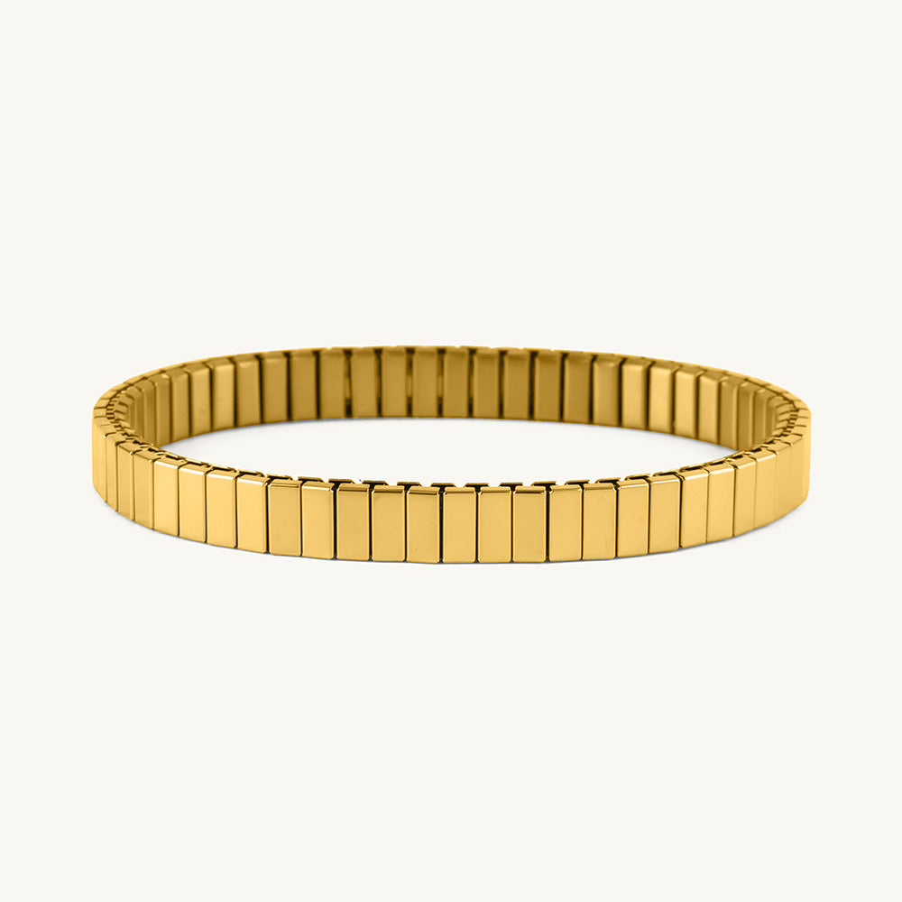 The Golden Flex bracelet offers effortless style with its adjustable, stretchable design in radiant 18k gold-tone stainless steel. Perfect for layering or wearing solo, it combines comfort with contemporary elegance. Its sleek, versatile look enhances both casual and dressy outfits, making it a must-have statement piece for everyday sophistication and refined glamour.