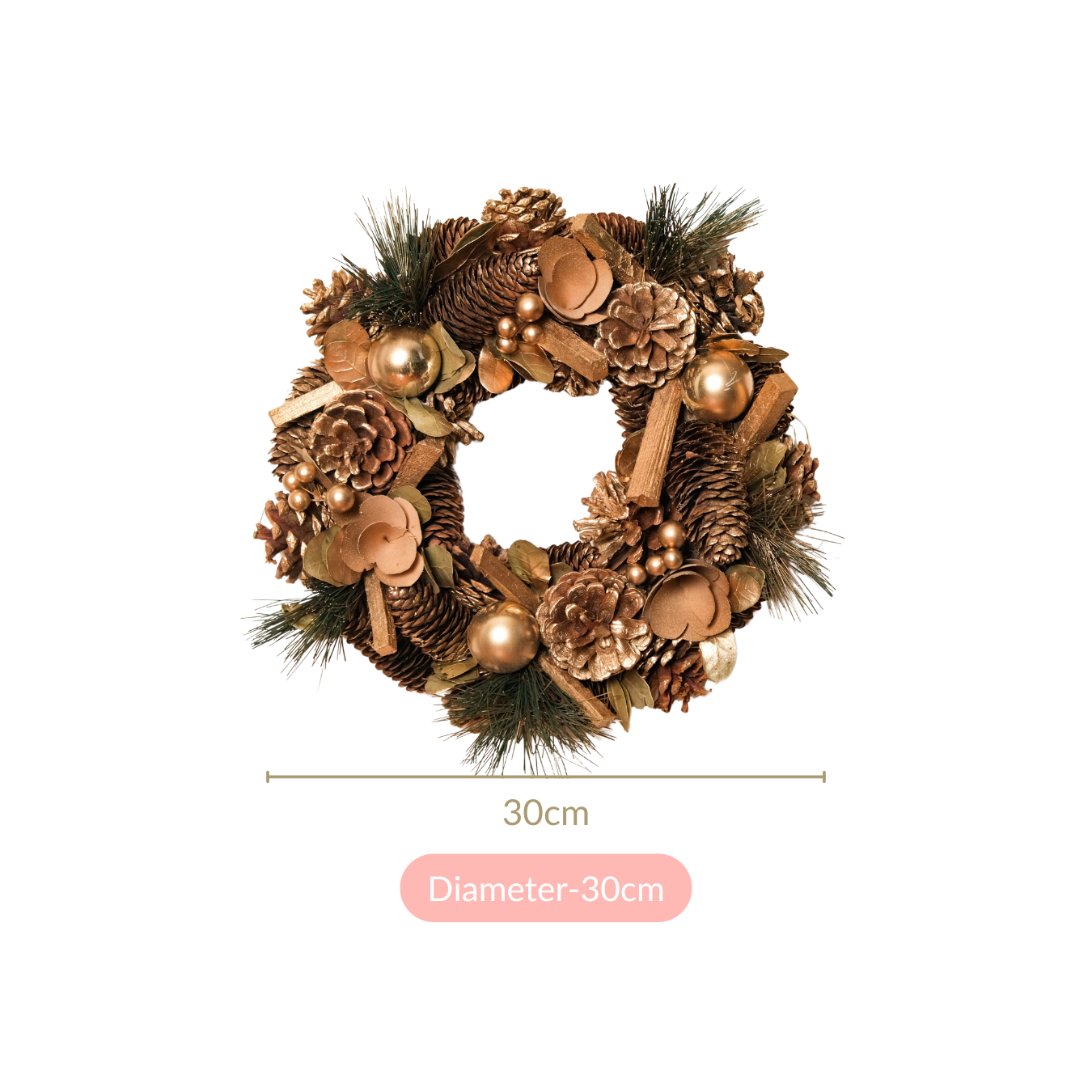 Design: The garland features beautifully dried pine cones and faux pine leaves painted in gold, creating a warm, luxurious feel. Artificial berries, natural dried leaves, and decorative balls further enhance the design, while decorative wooden blocks and wooden flowers in gold provide an elegant finish. The wreath is designed with a metal top hoop, making it easy to hang and display.