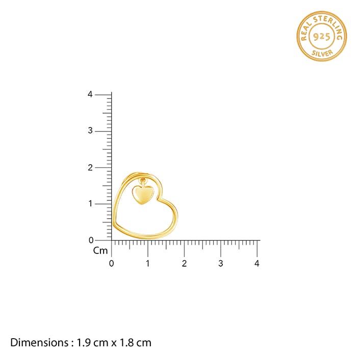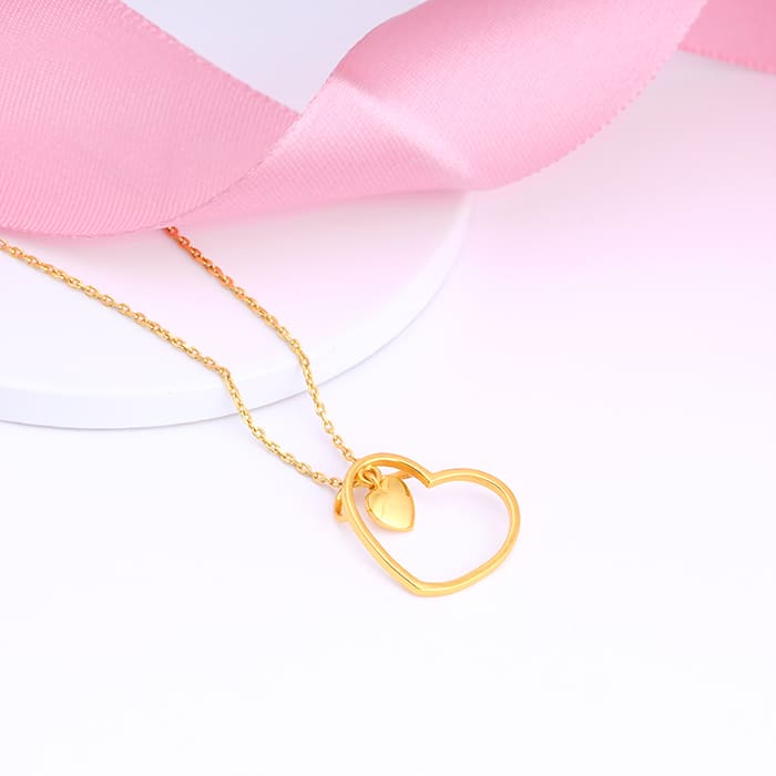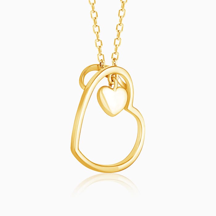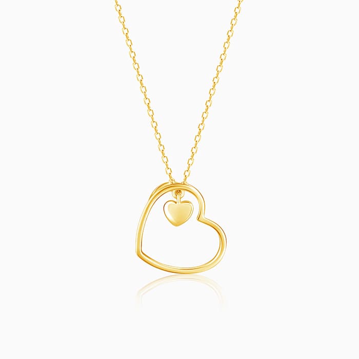The gold pendant has a diagonal heart charm encircling a smaller heart swaying and swirling.