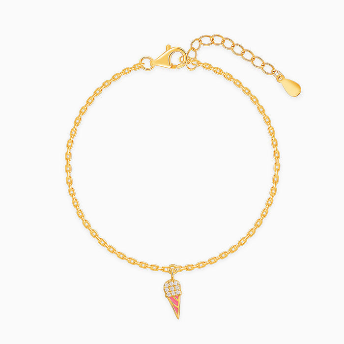 This gold plated kids bracelet features an ice cream motif. The cone is infused with enamel, and the scoop is studded with zircons.