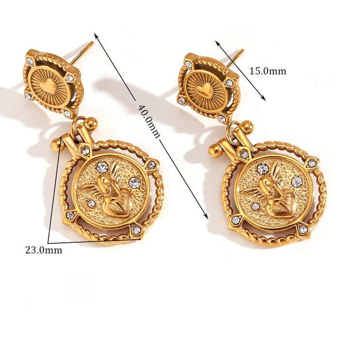 Trendy Freak' latest addition to the Vintage Love Collection – the “Golden Love Circles Earrings”. These resplendent earrings boast a dual-circle design, where the smaller circle is delicately embossed with intricately detailed hearts, reminiscent of classic romance. Dangling below, a larger circle holds a whimsical scene of a winged girl seated atop a heart, creating a charming tableau of timeless love. Bathed in a radiant golden hue, these earrings are a harmonious blend of vintage aesthetics and contemporary allure. Adorn yourself with these exquisite earrings from Trendy Freak and let them become an emblem of your unique love story.