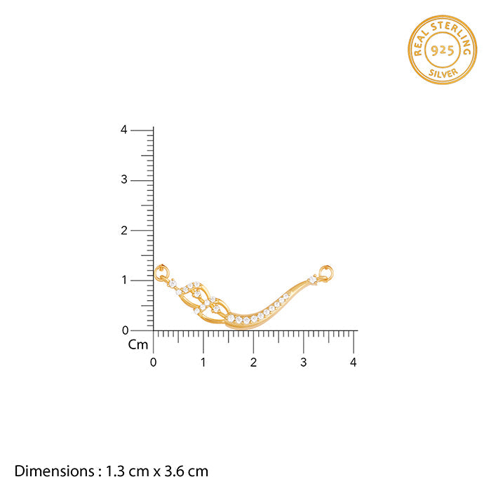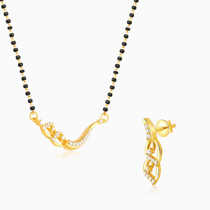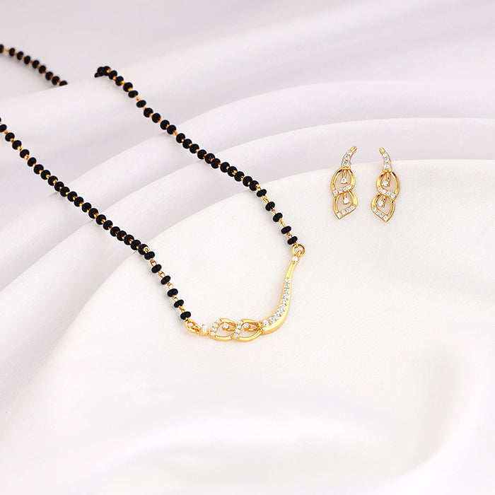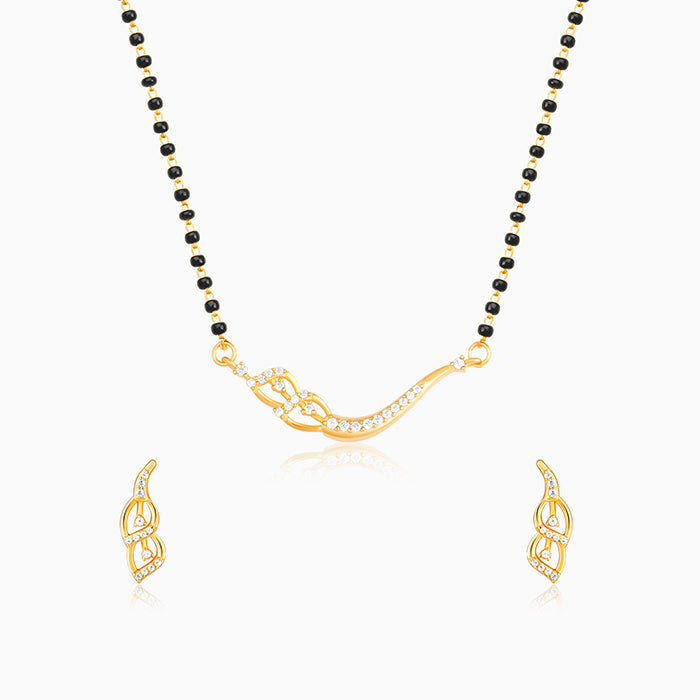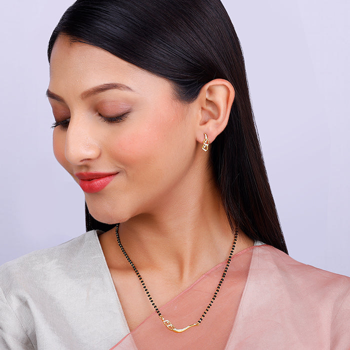 This set includes a mangalsutra and earrings. The golden earrings showcase a two-tiered leaf motif adorned with zircons. The Golden Match Made In Heaven Mangalsutra features an elegant design, boasting a golden finish and a black beaded chain.