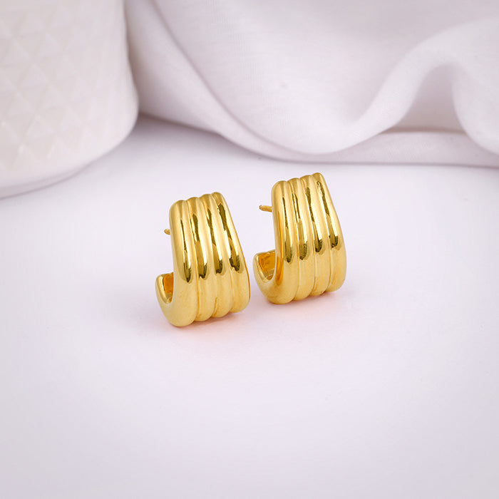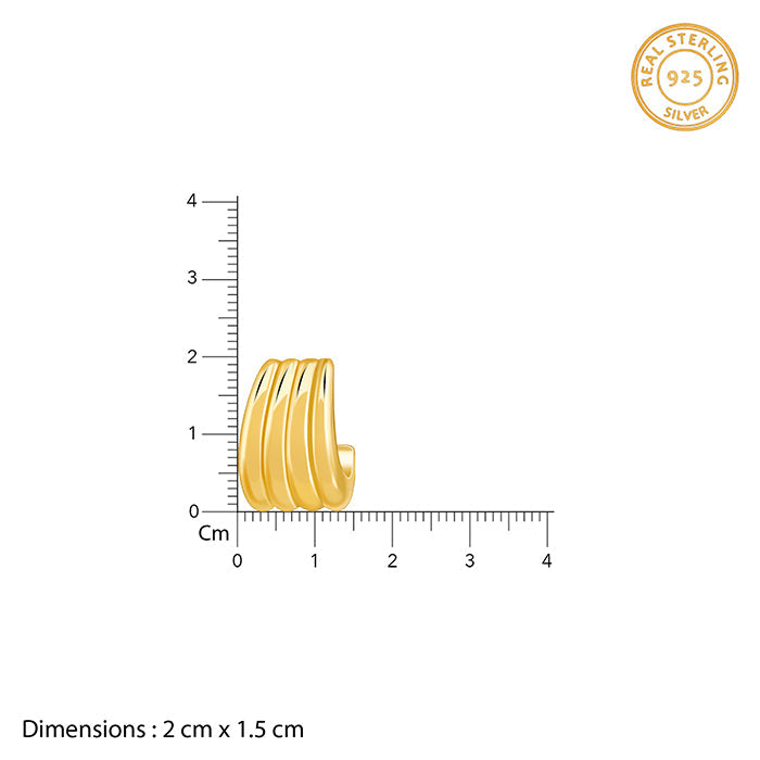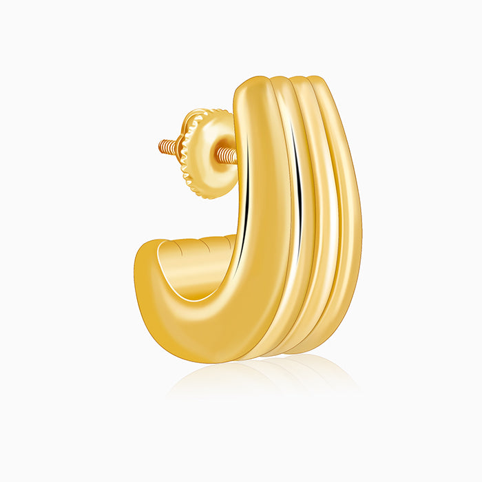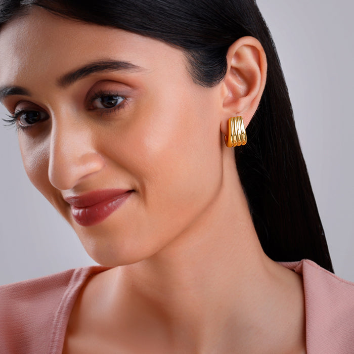 These gold plated earrings for women feature a unique J shape with a bold, vertically ridged texture.