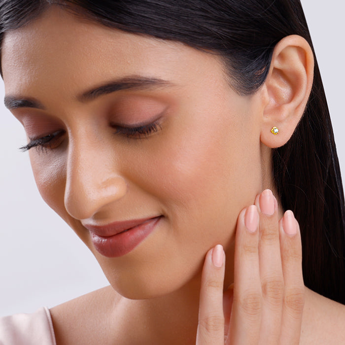 These golden earrings feature a floral motif with a circular zircon set at the centre.