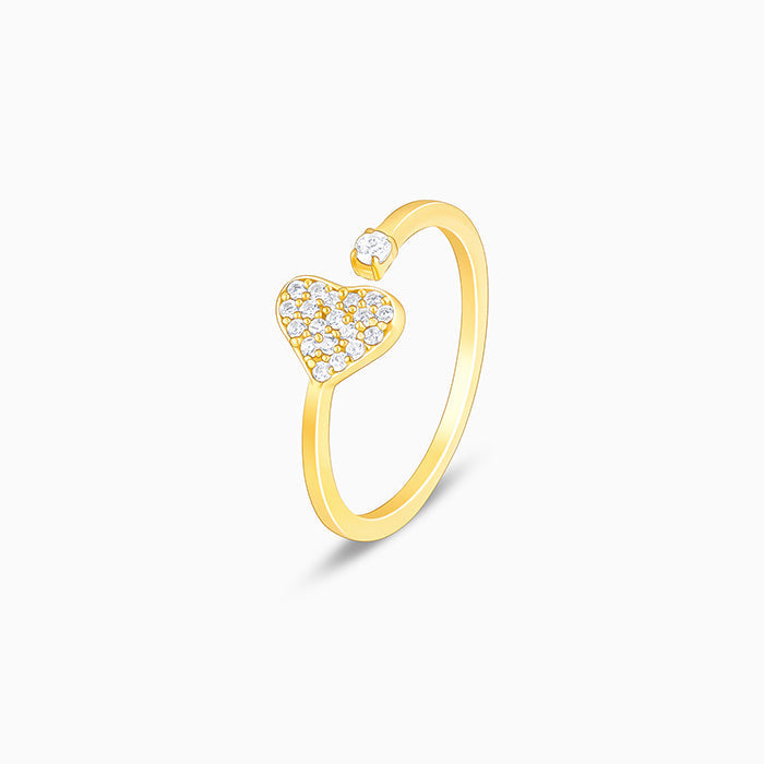 This golden open ring features a heart motif studded with zircons, with one zircon placed at one edge and another at the other end.