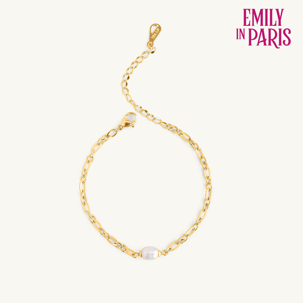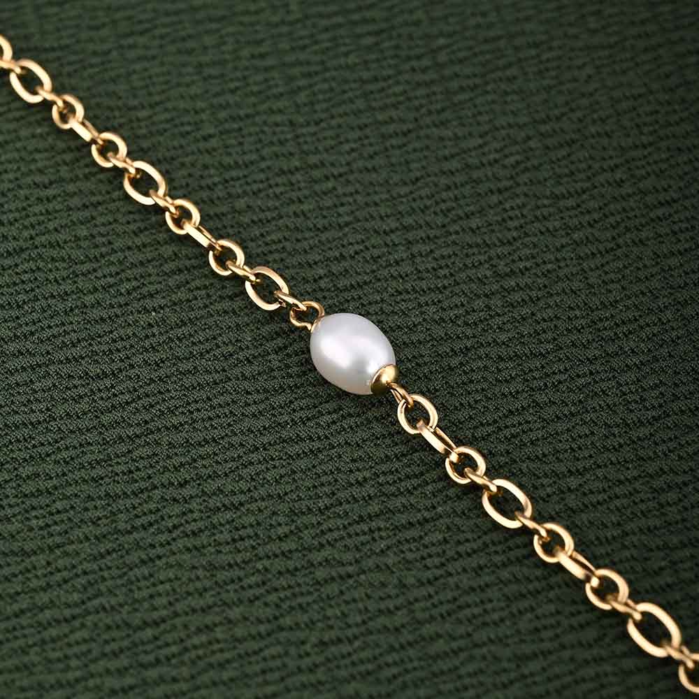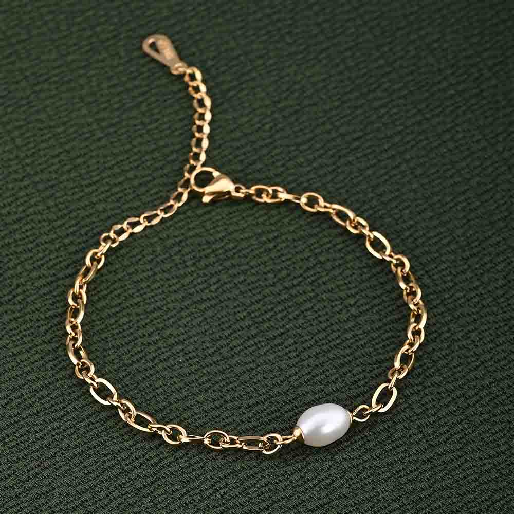 This delicate bracelet highlights a lustrous pearl at the center, set on a refined golden chain. Lightweight and polished, it combines timeless beauty with modern craftsmanship. The adjustable clasp ensures comfort, while the pearl brings natural radiance, making it a graceful and meaningful accessory.