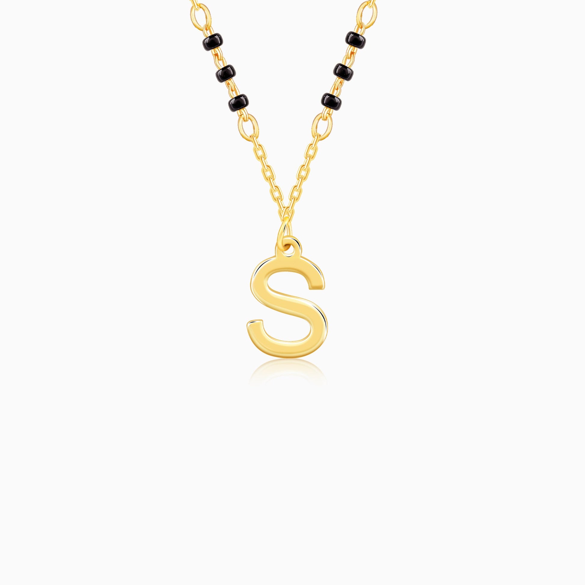 This personalised gold plated mangalsutra for women features an initial of your choice as the pendant. The chain features three black beads, adding to its minimalistic beauty.