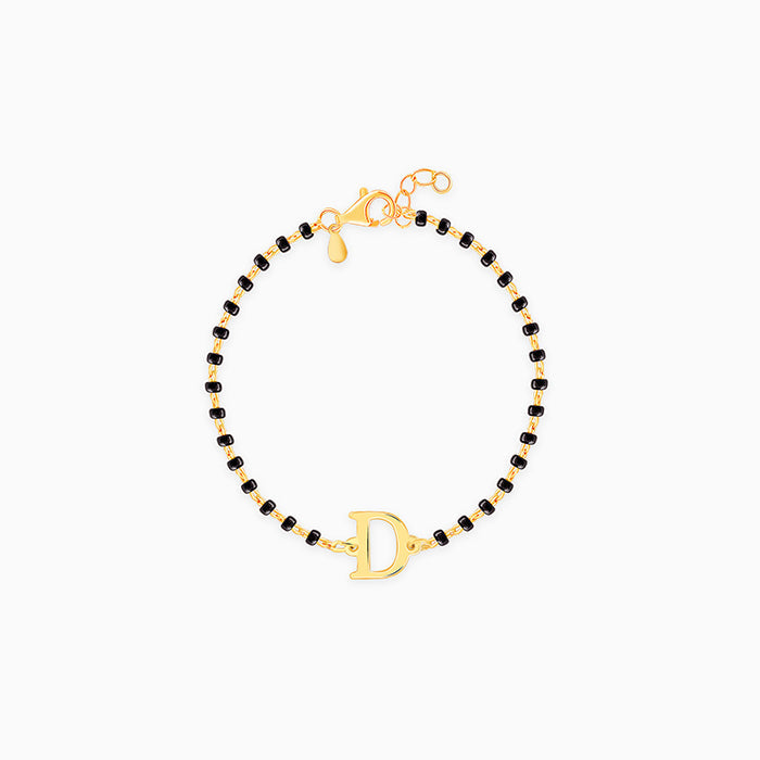 This gold plated personalised bracelet for kids features an initial of your choice, with black beads set along the chain.
