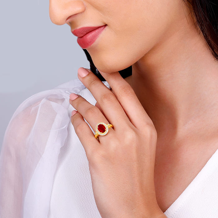 This golden ring has a zircon studded oval design nestling a red-coloured stone in the centre.