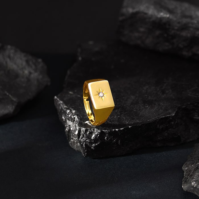 This gold plated ring for him has a rectangular shape with a star-engraved design nestling a zircon in the centre.