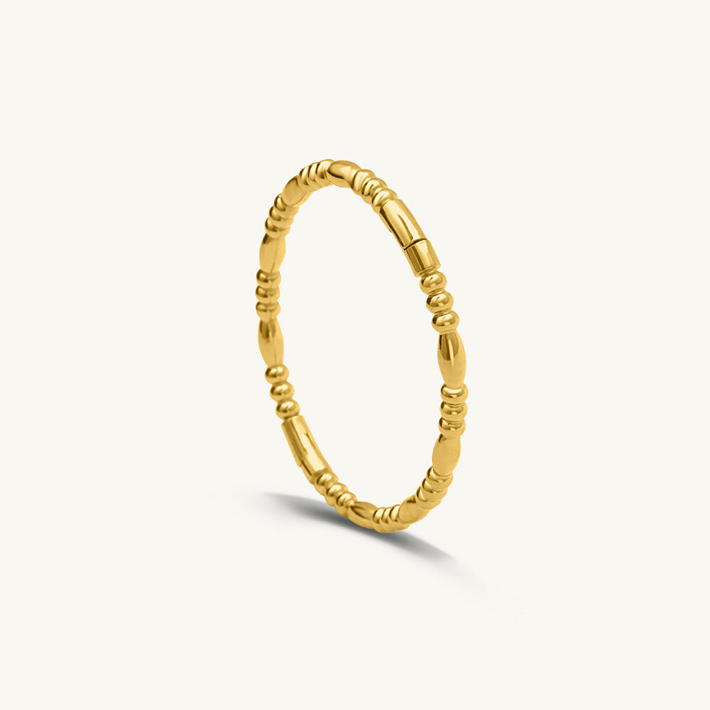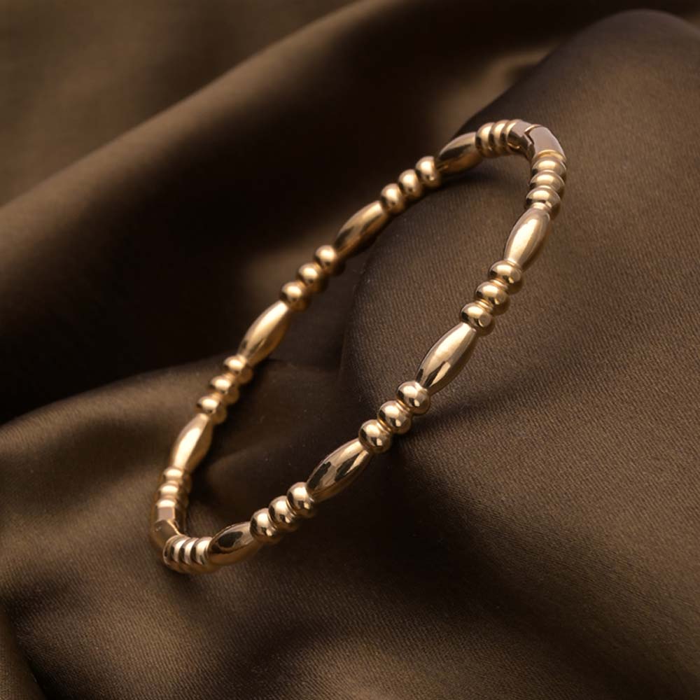This unique bangle bracelet design flows immaculately around your wrist mimicking a ray of golden sunshine. Its beaded design and gold finish capture the warmth of a summer day flawlessly. The polished finish is sure to add a touch of refinement to your style.