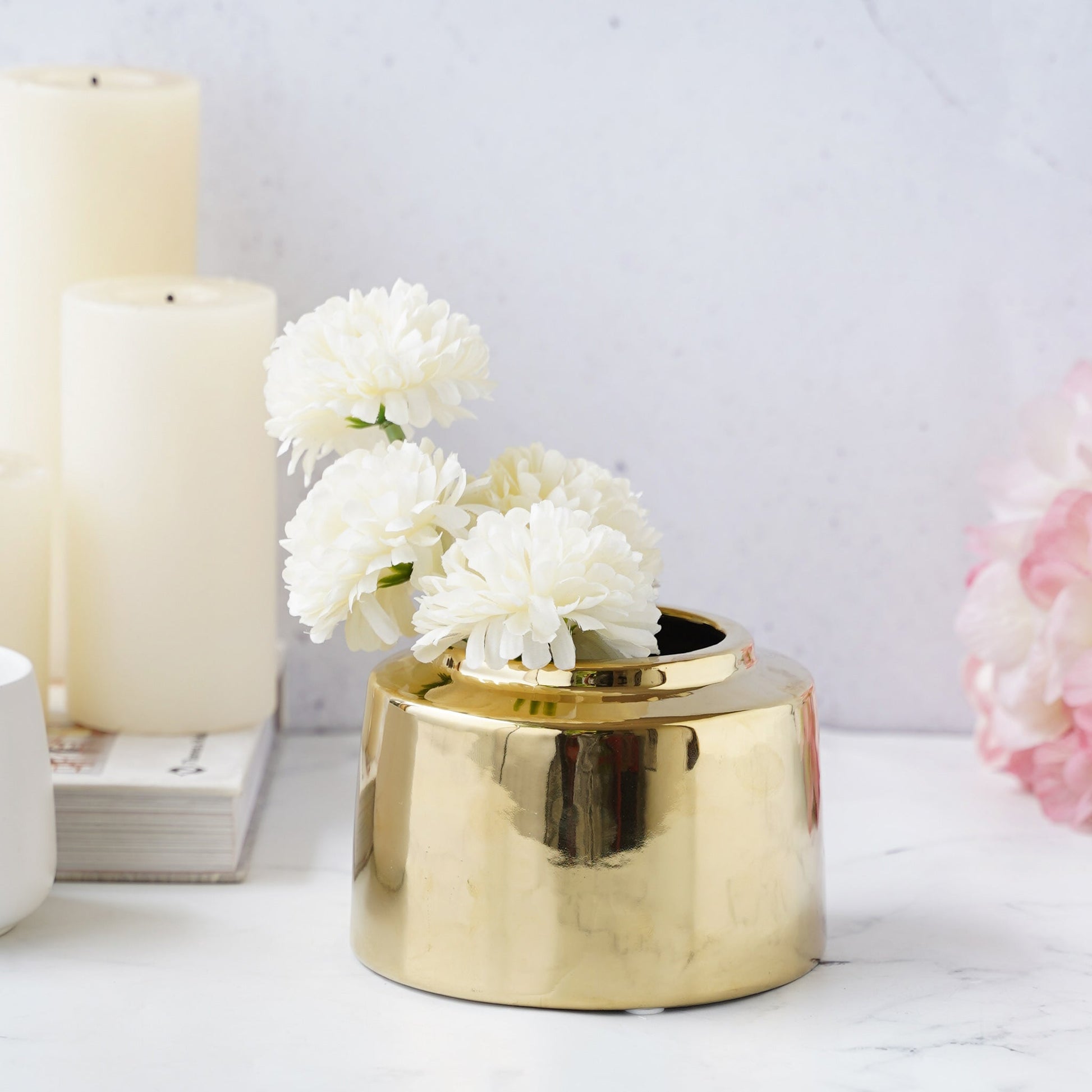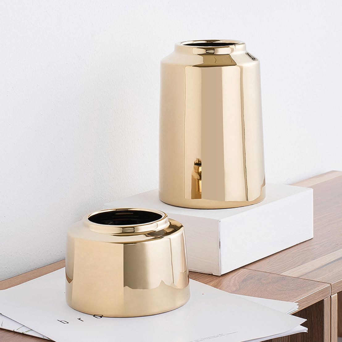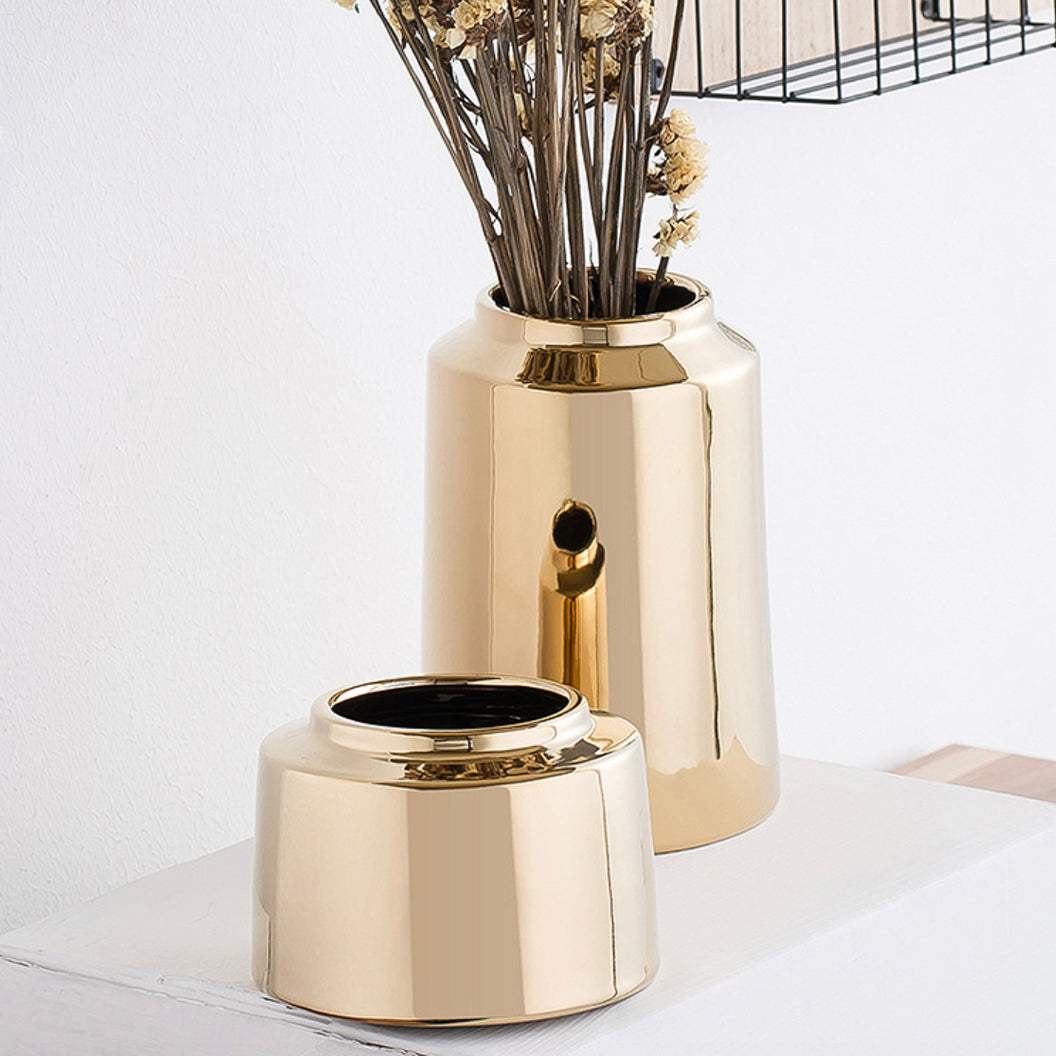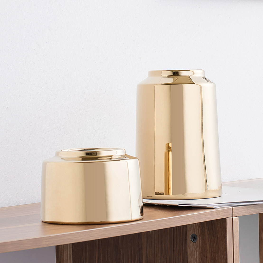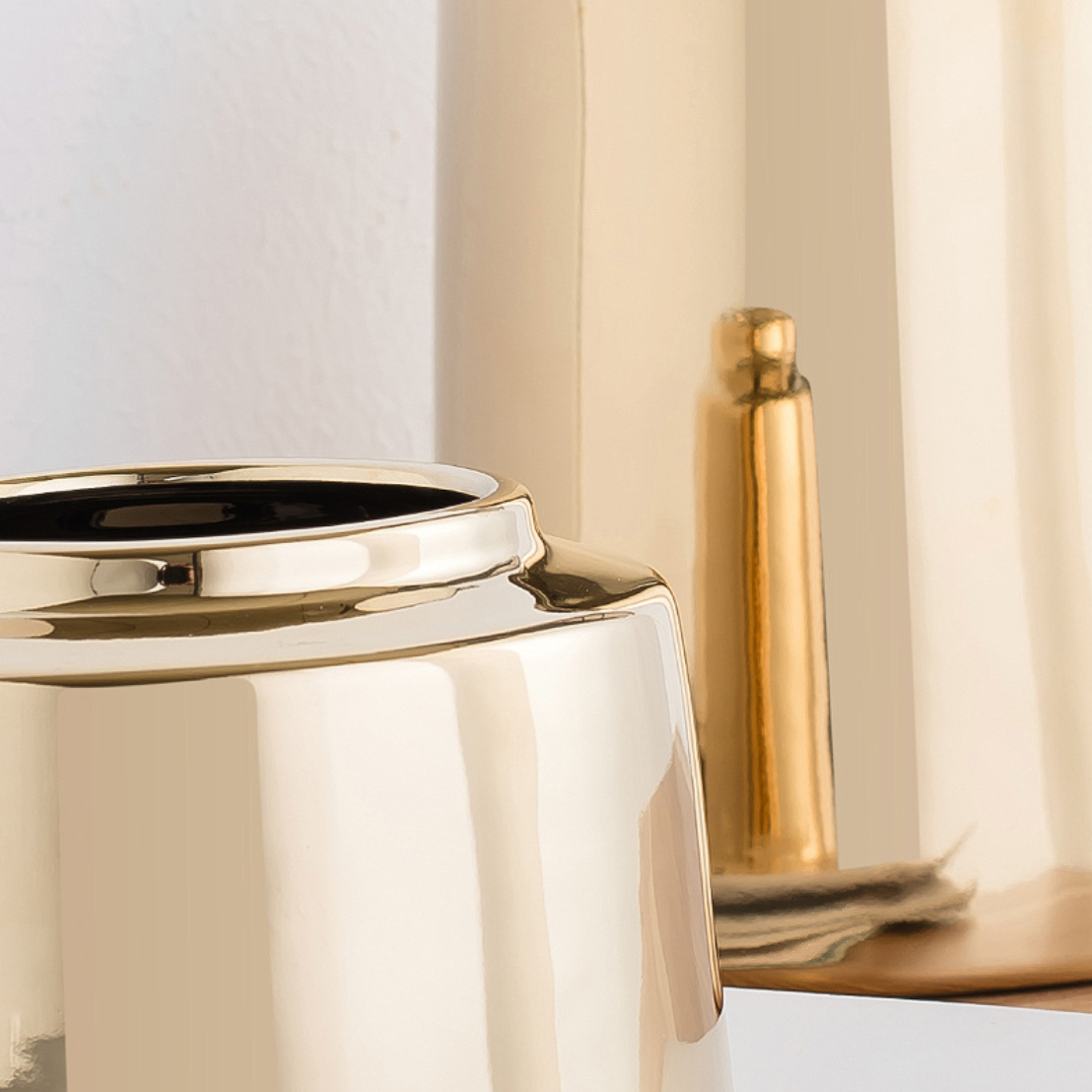 Golden vase with a minimal aesthetic for a modern household. The vase is wide and contemporary. It can be given as a thoughtful gift for any housewarming party. The gold vase can be placed in the bedroom, living room, or straight at the dining table along with some modern tableware.