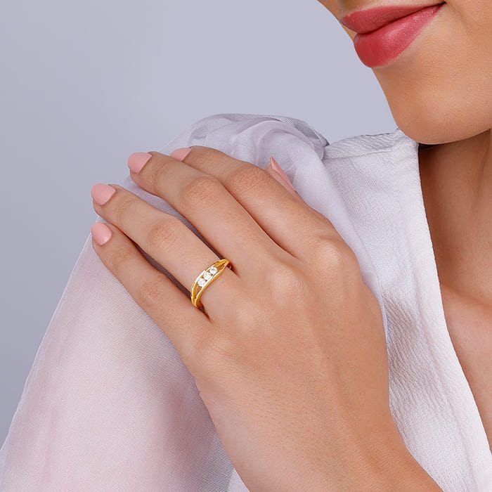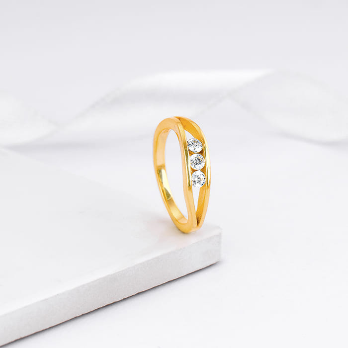 This golden ring features a dual-layer wave design with zircons placed in between.