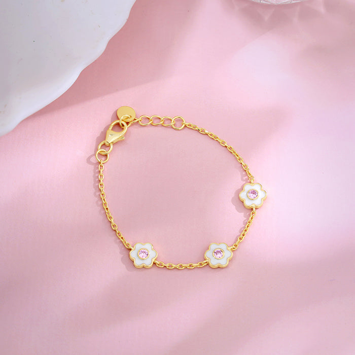 This gold plated bracelet for kids features a three-flower design with enamel and a zircon placed at the centre.