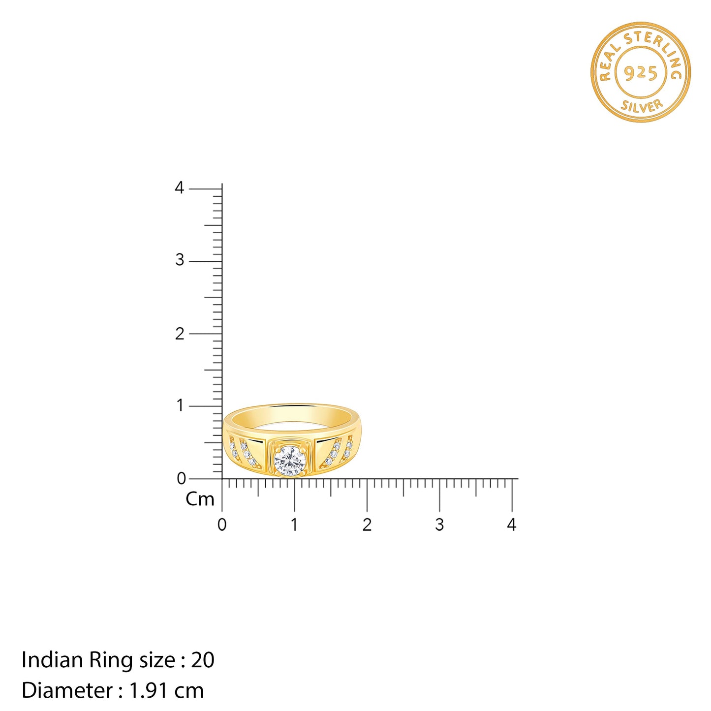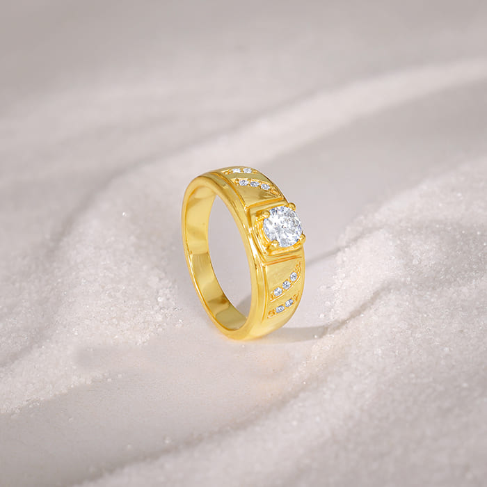 This mens gold plated ring features a zircon in the centre with minimal embellishments on the band.