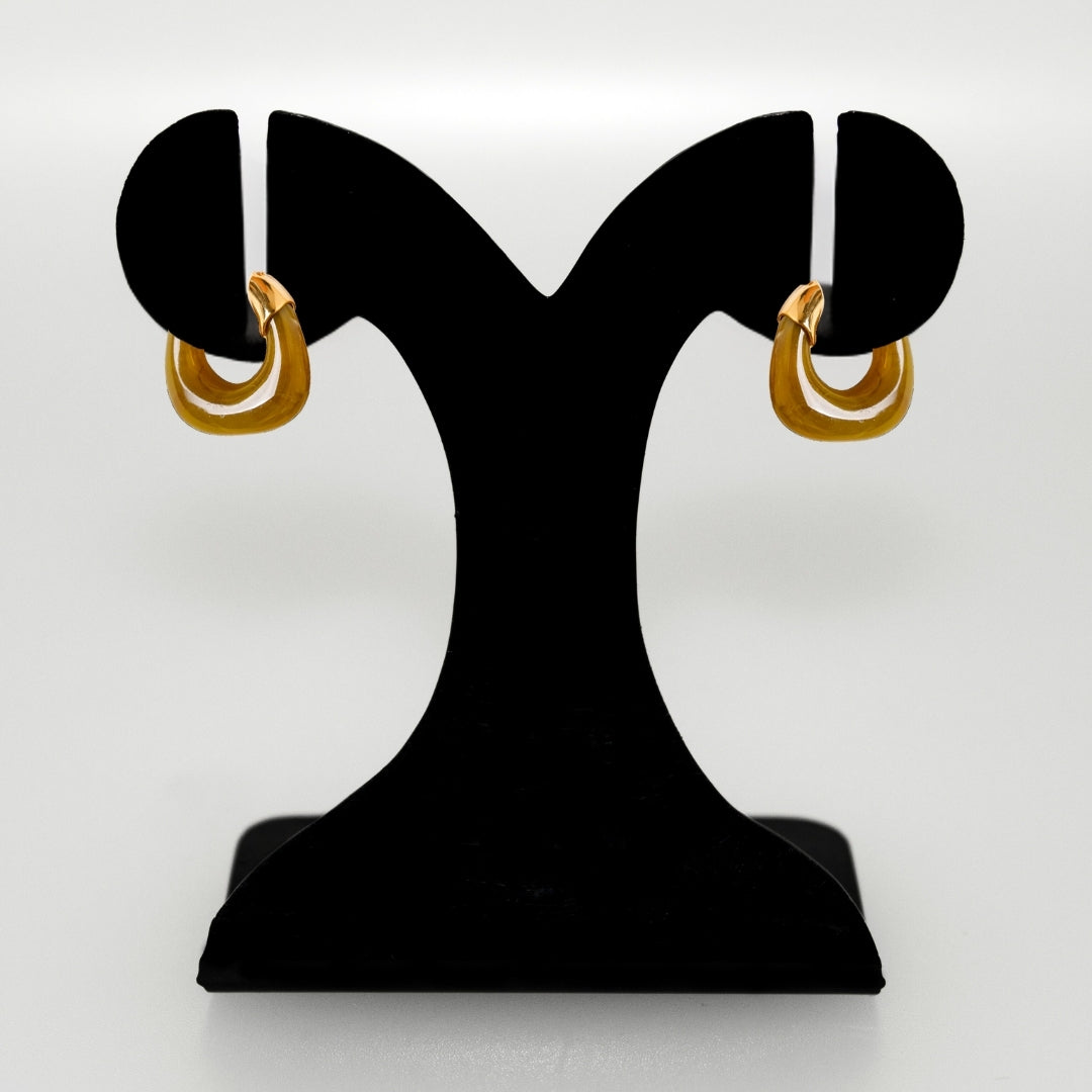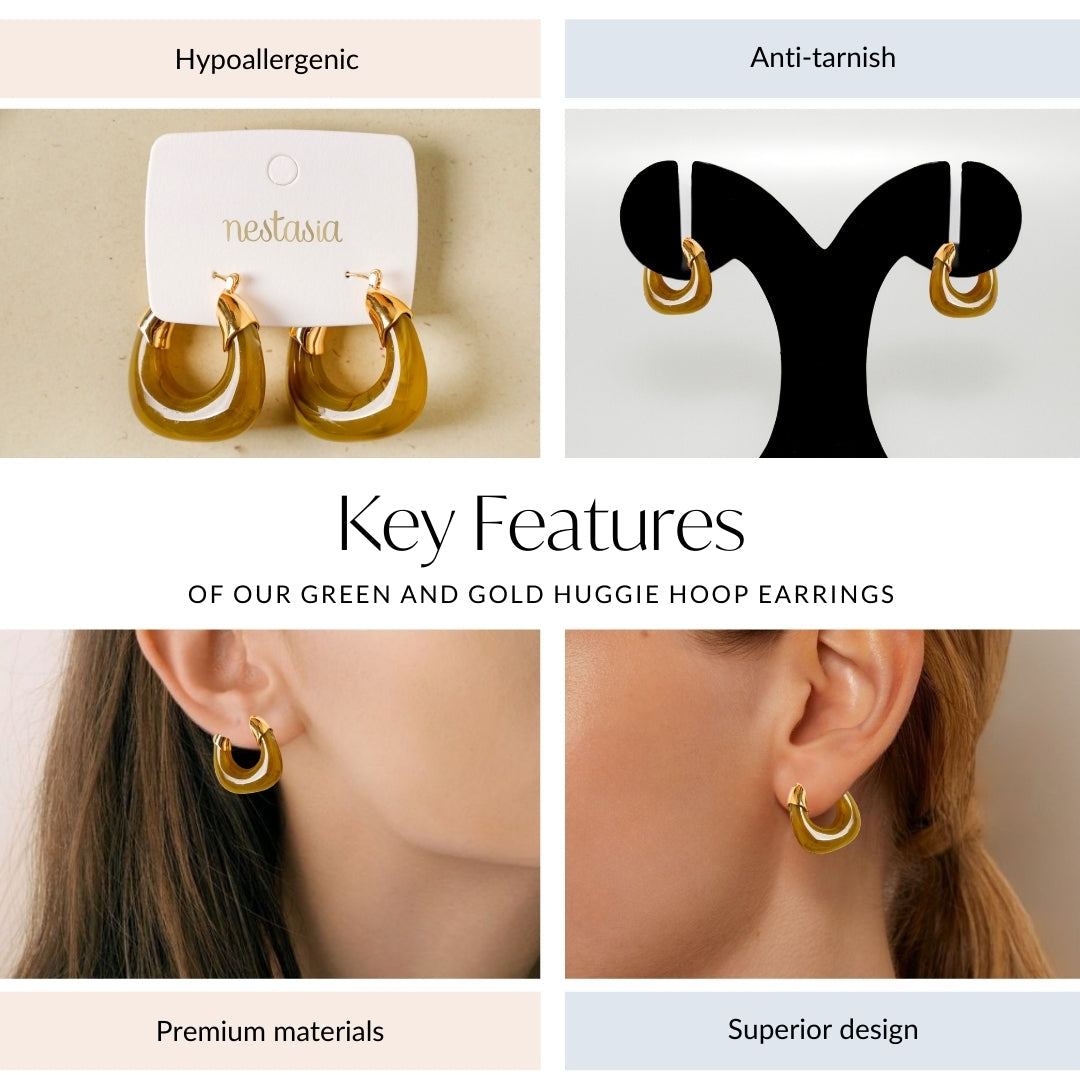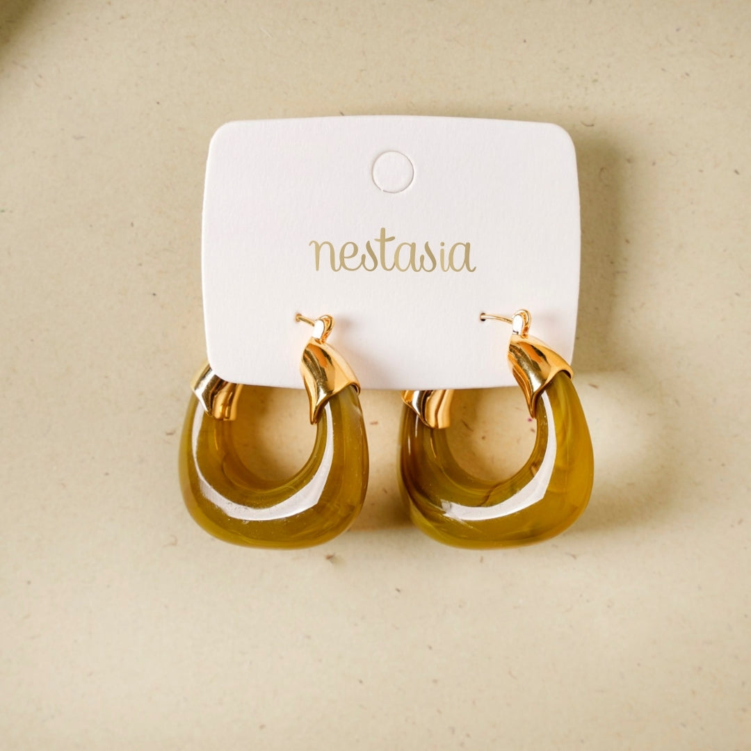 A captivating blend of nature and luxury, the green translucent huggie earrings showcase light green patterns that mirror the elegance of gemstones. Gold metal accents at the ends elevate their beauty, making them the perfect statement piece for any occasion.
