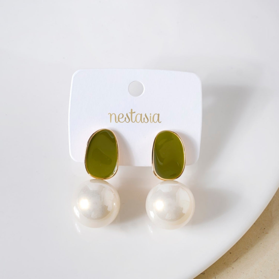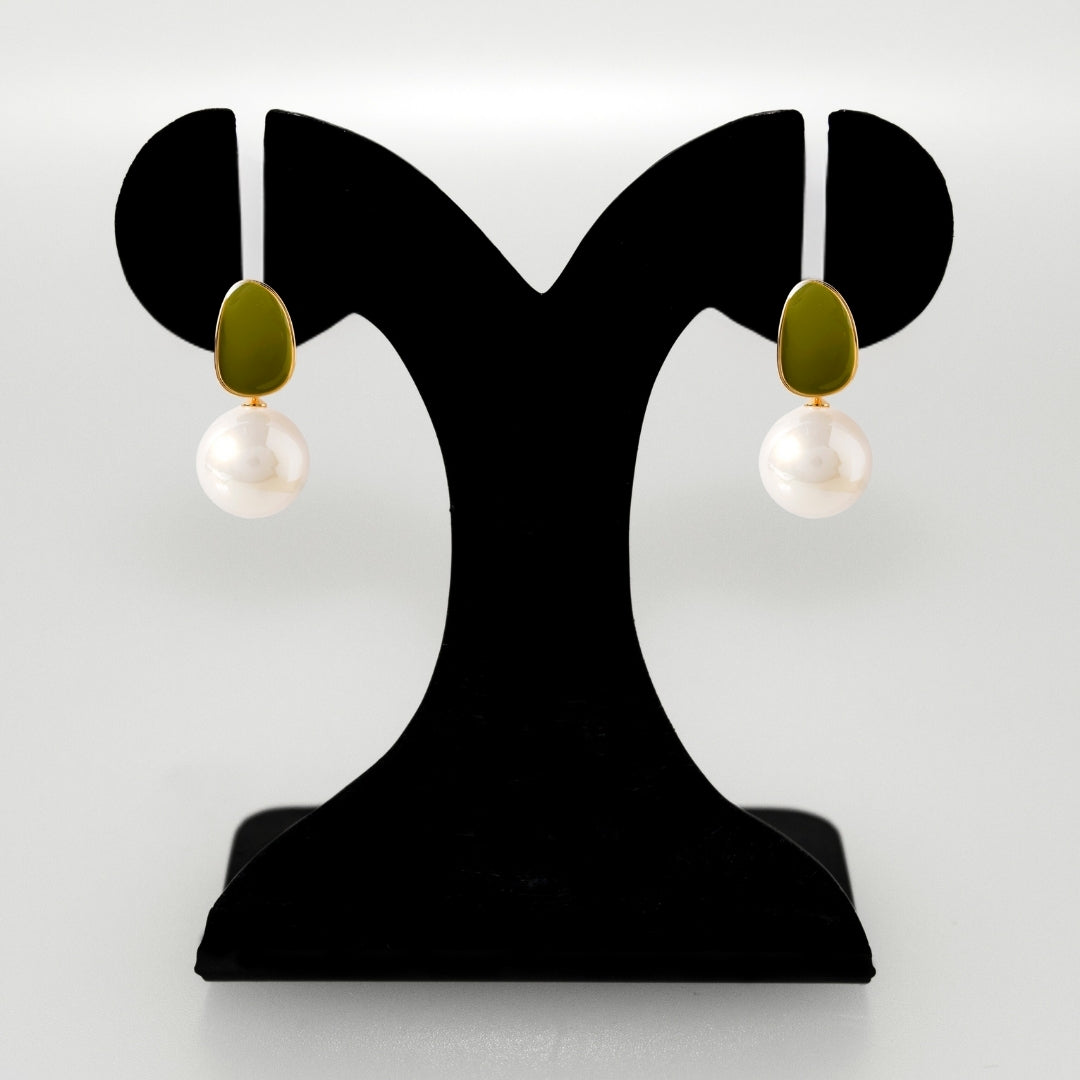Add a pop of colour and elegance to your look with these green resin earrings bordered in gold. The fresh white faux pearl drop adds a delicate contrast, making them a versatile choice for both everyday wear and special occasions.