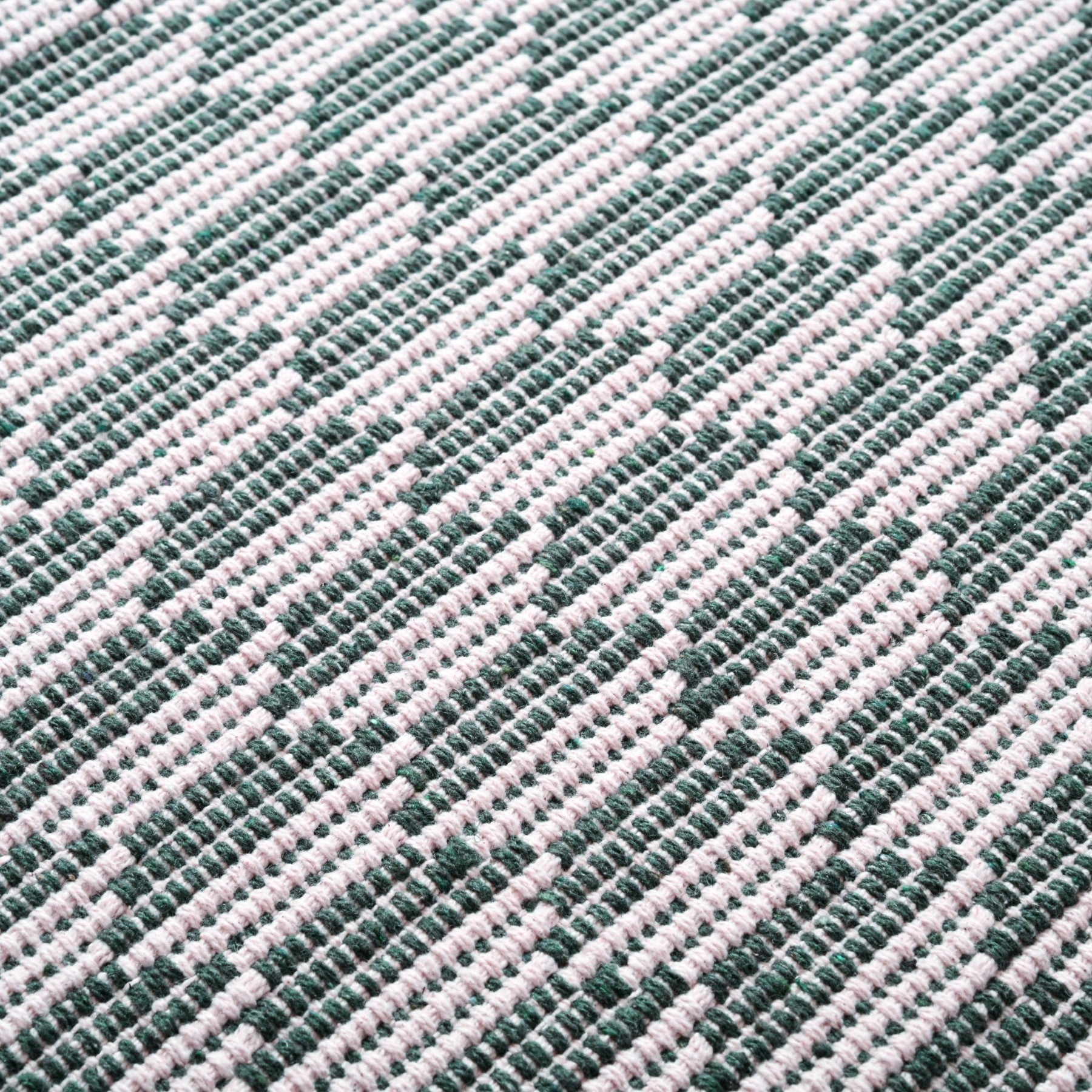 Design: This floor mat features a striking geometric pattern of interlocking blocks in olive green and off-white. The staggered rows form a zigzag design that adds visual depth and movement. Intricately woven with a tight, uniform texture, it reflects expert craftsmanship and balance. Made from recycled cotton, the mat is soft yet sturdy. The visible weaves highlight the recycled cotton’s natural, rustic character, making it a versatile fit for modern, minimalist, or cosy interiors.