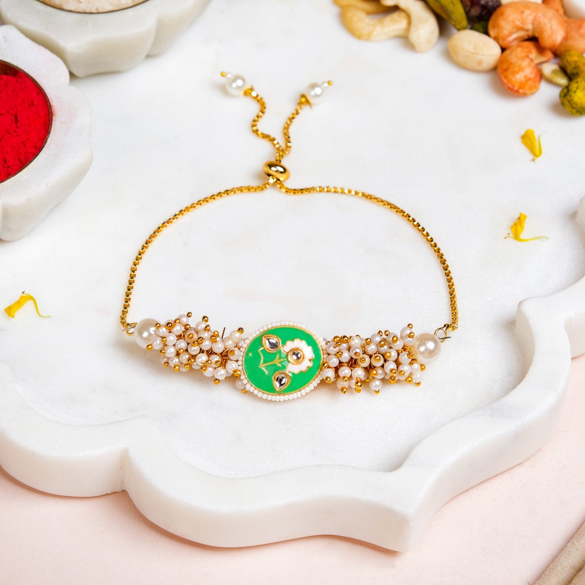 Pearls to the rescue! Our beautiful green rakhi set is the season's perfect gift for your brother. It carefully mixes traditional style with contemporary design in a way that the oval centre has a beautiful minimalist flower embedded with kundan stones. The enamel at the centre is green and is bordered with shiny white beads. The golden adjustable chain makes it easy to tie comfortably on any wrist, and the pearl-tipped ends add an extra touch of beauty. The rakhi comes as a complete part of a set which also includes 1 dry fruits packet, 1 wish card and 1 roli-chawal bottle set.