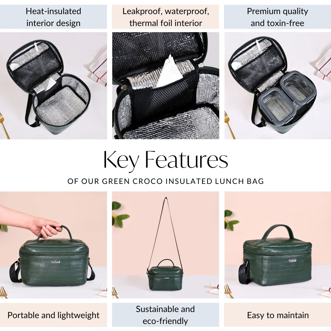 Lunchtime just got an upgrade! The green croco insulated lunch bag keeps your meals fresh and at the perfect temperature while adding a chic touch to your everyday routine.