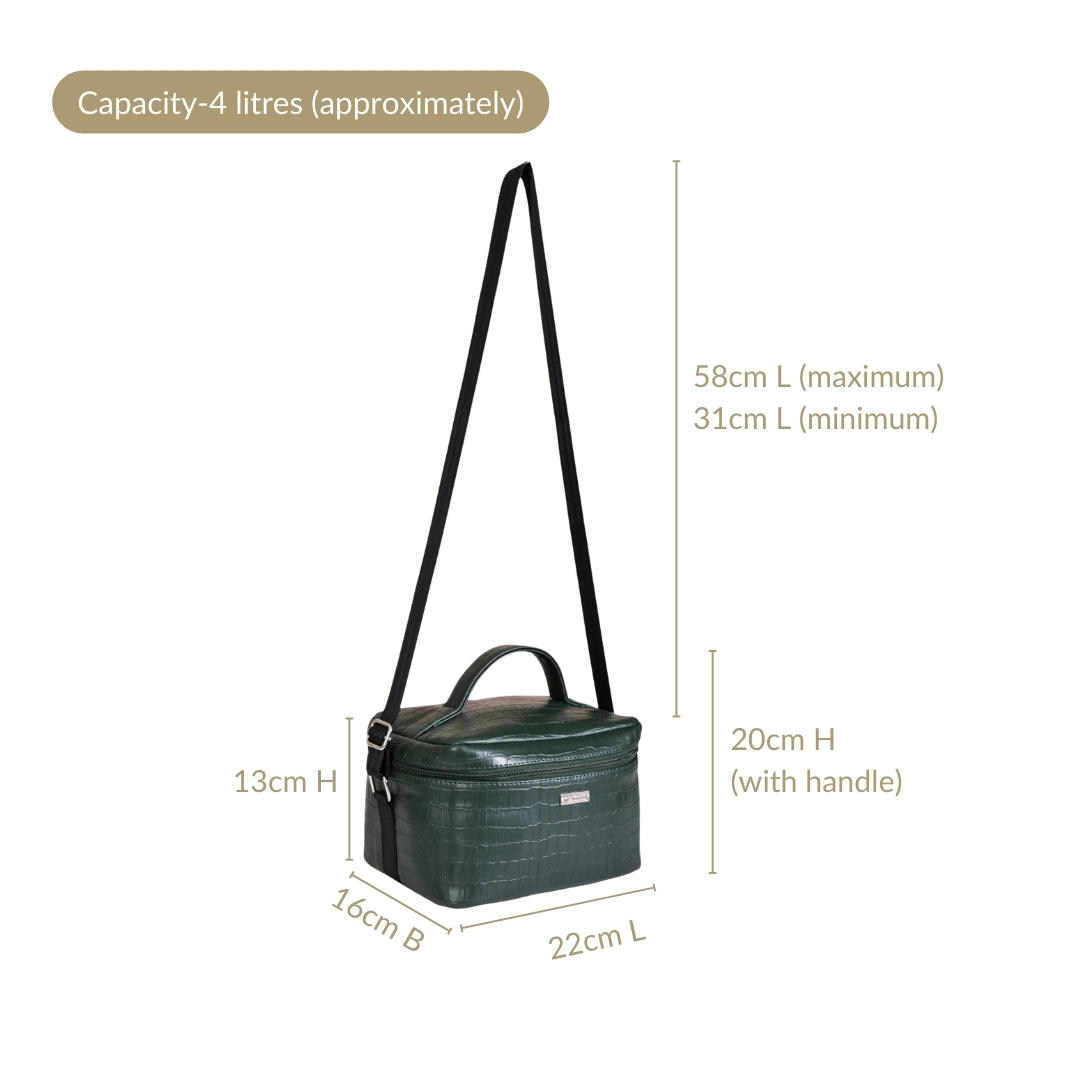 Design: With its green croco-patterned exterior, this lunch bag is as fashionable as it is functional. The cushiony outer body gives it a premium feel, while the stitched top handle and adjustable shoulder strap offer easy carrying options. The smooth chain and dual zipper closure make it simple to open and secure your food inside. The insulated interior ensures that your meals stay warm or cool for hours, so you can enjoy fresh, home-cooked food anytime. It’s spacious enough to fit lunch boxes, snacks, and drinks, while two net pockets provide extra space for cutlery, napkins, or small essentials.
