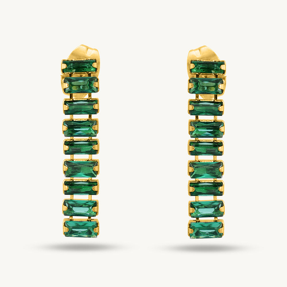 Add a refreshing pop of color to your collection with the Green Emerald Drop Earrings. Made with durable stainless steel and finished in luxurious 18k gold plating, these earrings are embellished with 18 sparkling green emerald stones. Their lightweight yet striking design makes them perfect for both everyday wear and special occasions. With a waterproof and anti-tarnish finish, they’re crafted to retain their brilliance season after season.