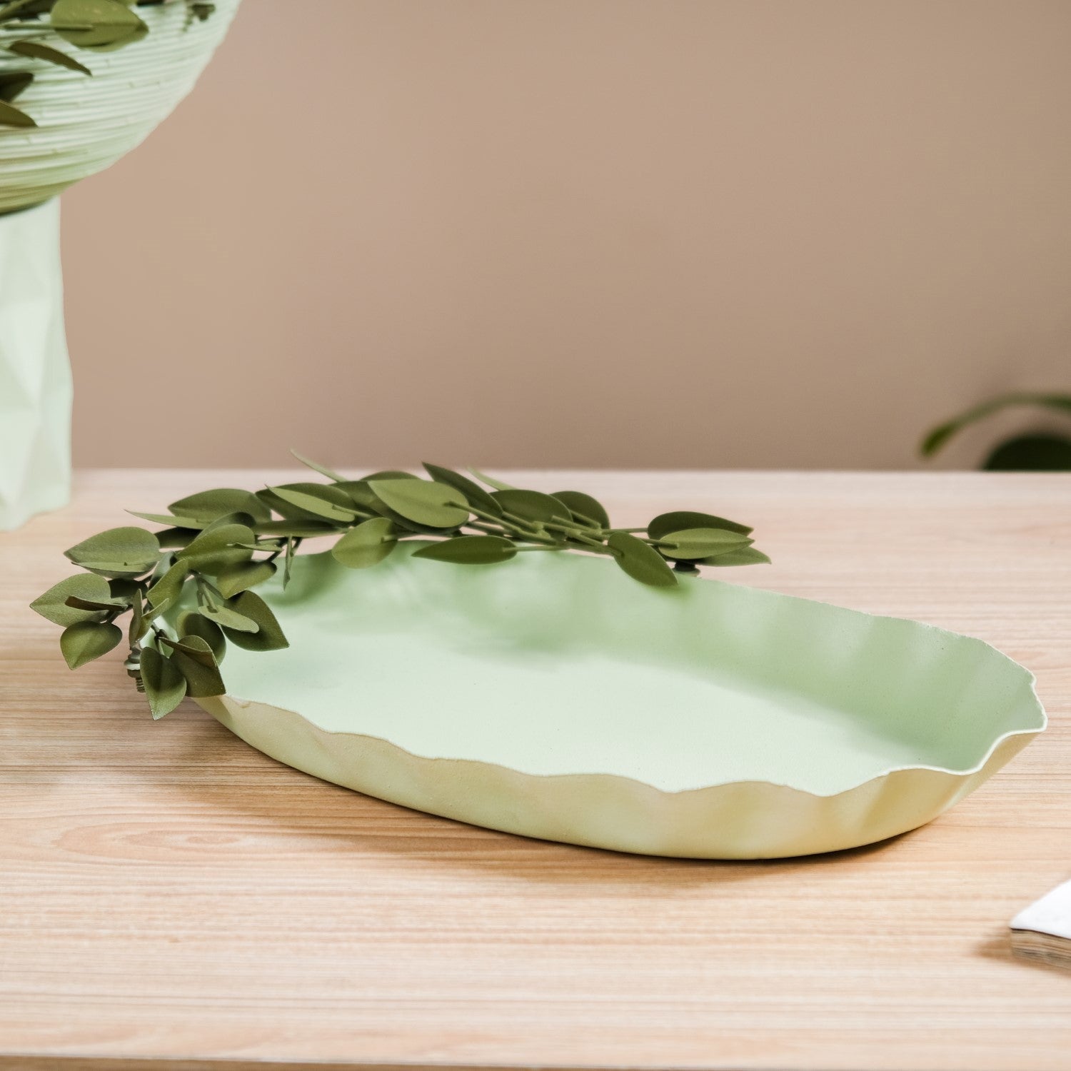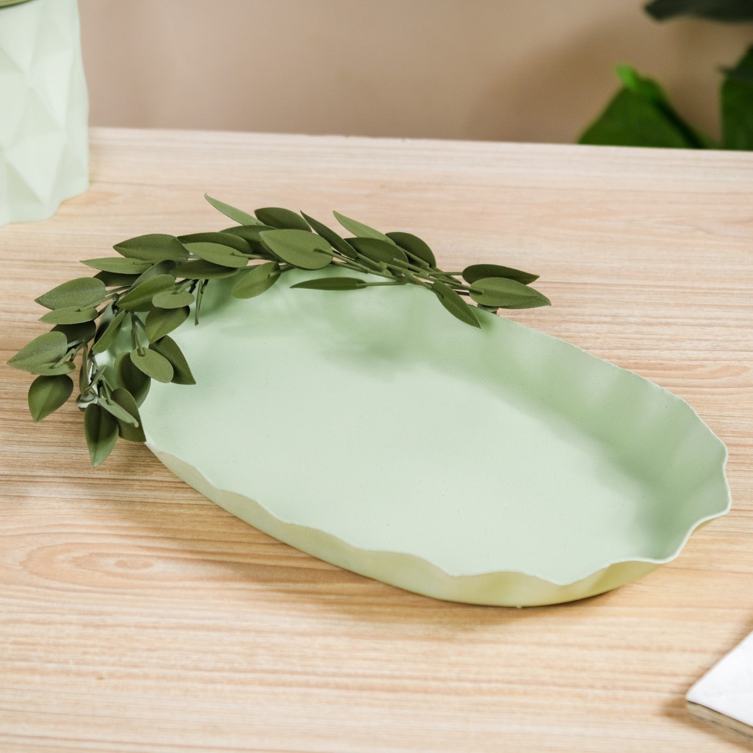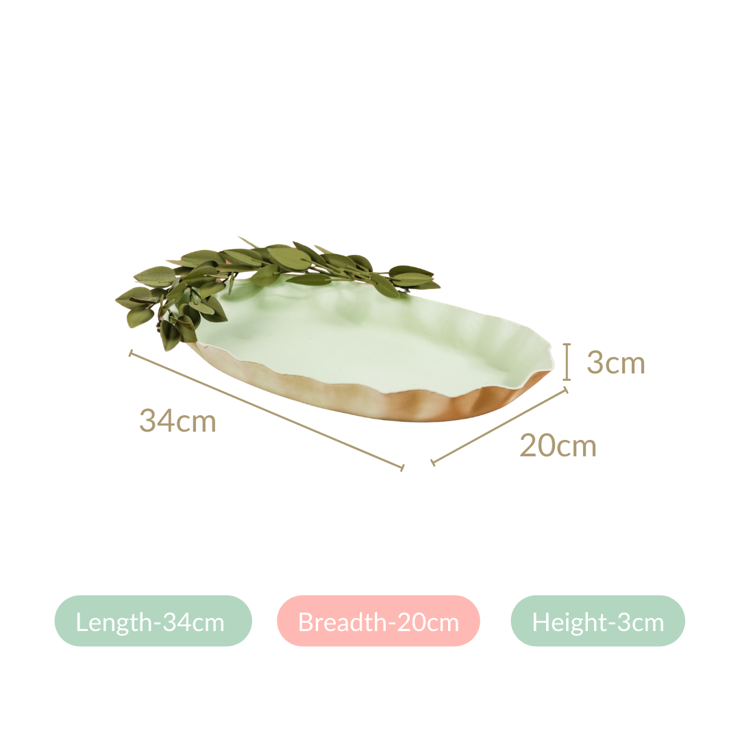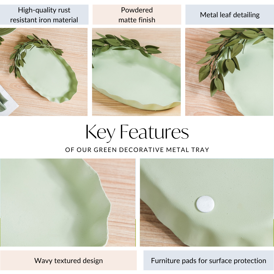Introducing our exquisite metal decorative tray, crafted from high-quality iron material to ensure durability and longevity. Its rust-resistant construction makes it perfect for both indoor and outdoor use, while the powdered matte finish adds a touch of elegance to any space. The tray features intricate metal leaf detailing and a wavy, textured design, creating a stunning visual appeal that is sure to impress. Designed with furniture pads for surface protection, you can confidently display this tray on any tabletop or countertop without worrying about scratches or damage.