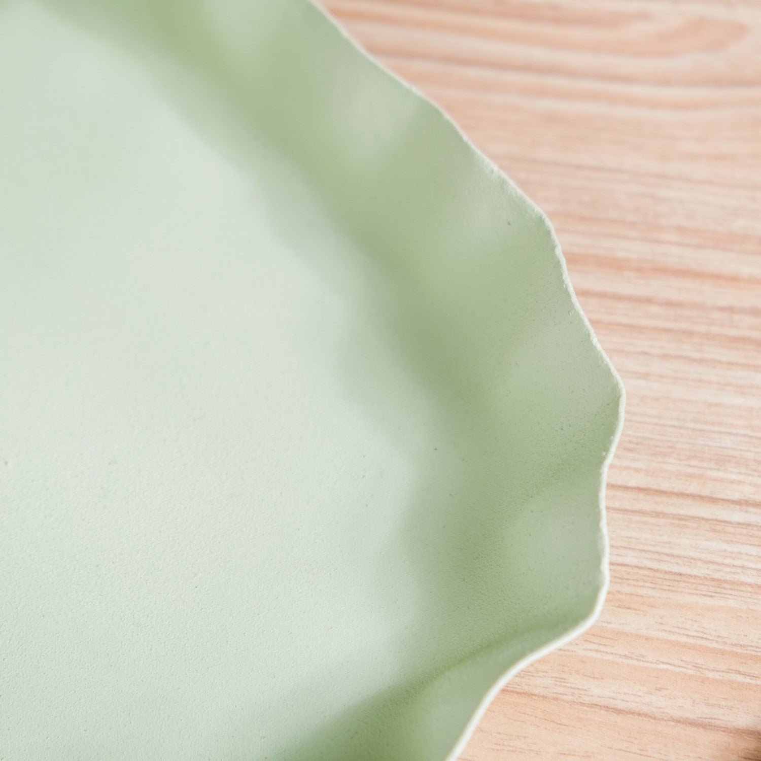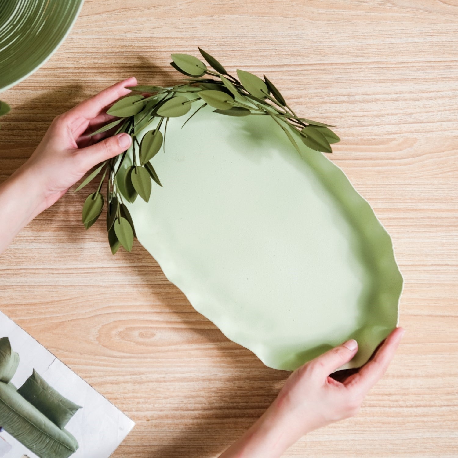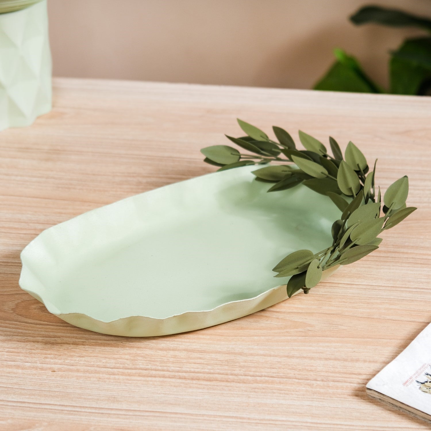 Introducing our exquisite metal decorative tray, crafted from high-quality iron material to ensure durability and longevity. Its rust-resistant construction makes it perfect for both indoor and outdoor use, while the powdered matte finish adds a touch of elegance to any space. The tray features intricate metal leaf detailing and a wavy, textured design, creating a stunning visual appeal that is sure to impress. Designed with furniture pads for surface protection, you can confidently display this tray on any tabletop or countertop without worrying about scratches or damage.