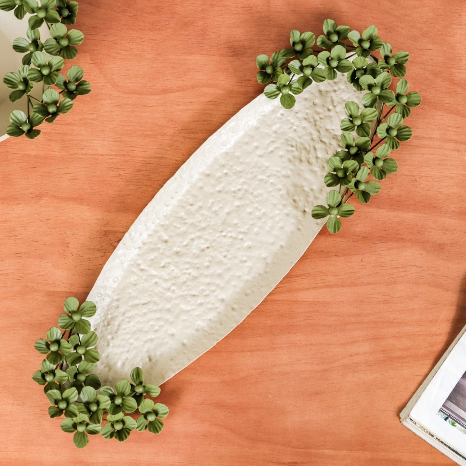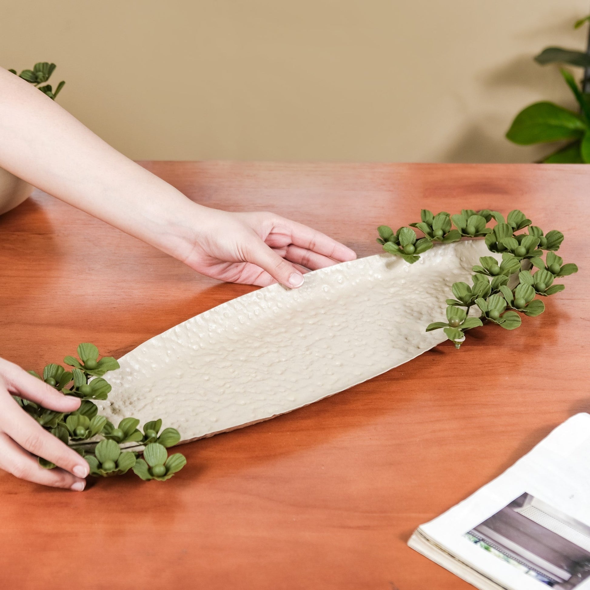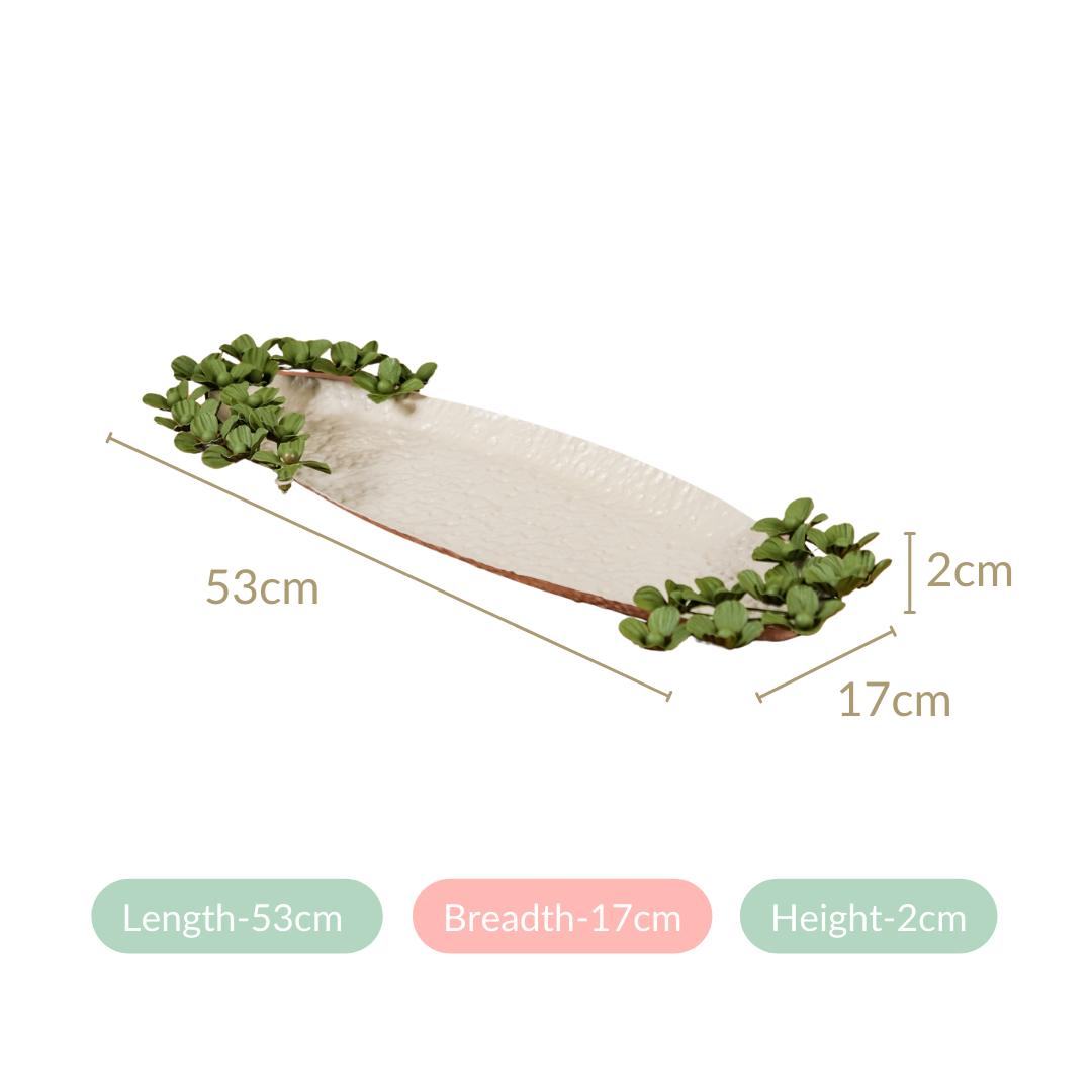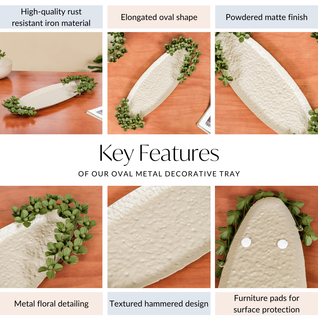 Introducing our exquisite oval elongated decorative tray, a captivating addition to your home decor collection. Crafted from premium-quality, rust-resistant iron, this tray boasts an elongated oval shape that exudes sophistication. Its matte finish and intricate floral detailing add an elegant touch, while the elongated design offers ample space for displaying your favourite items. Whether used as a serving tray or as a decorative accent, its versatility knows no bounds. With foam furniture pads for surface protection and easy-to-clean features, this metal tray seamlessly combines style with functionality, making it a must-have for any space. Elevate your home decor with this timeless piece and add a touch of luxury to your surroundings.
