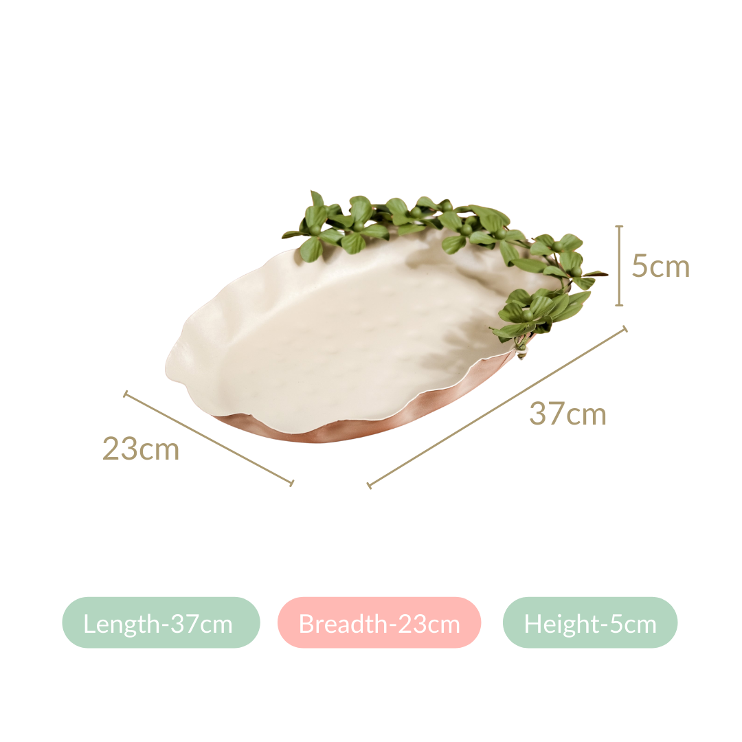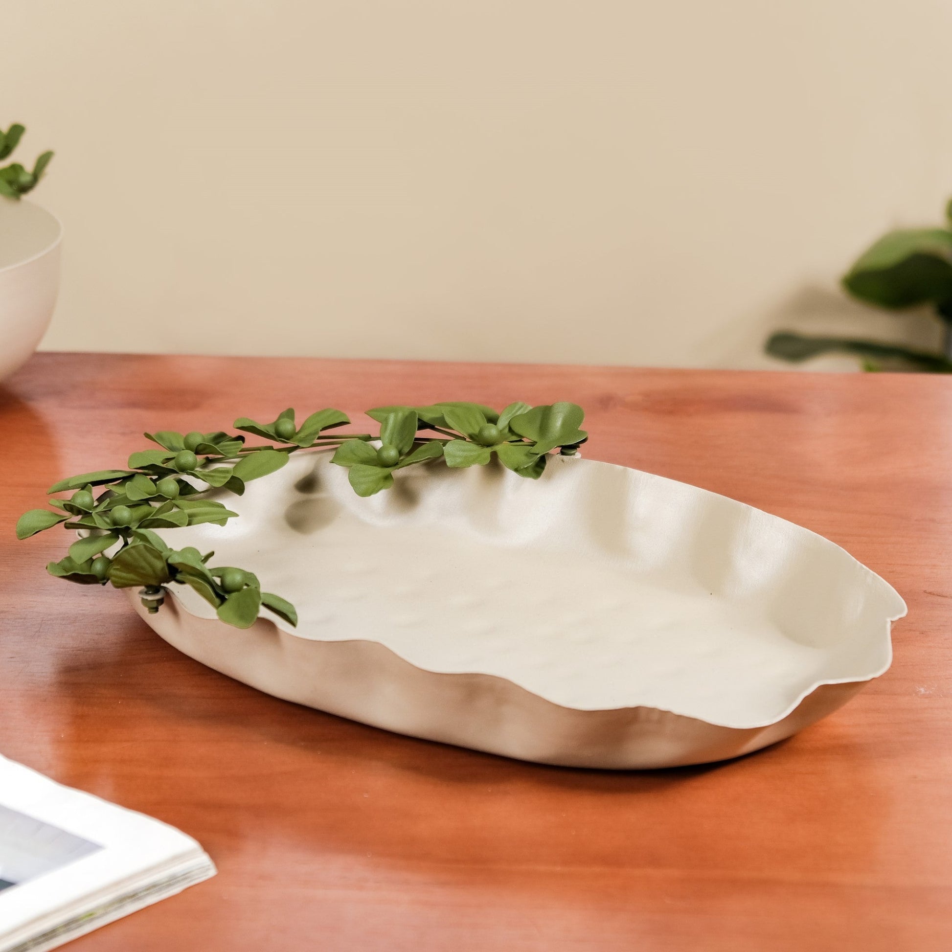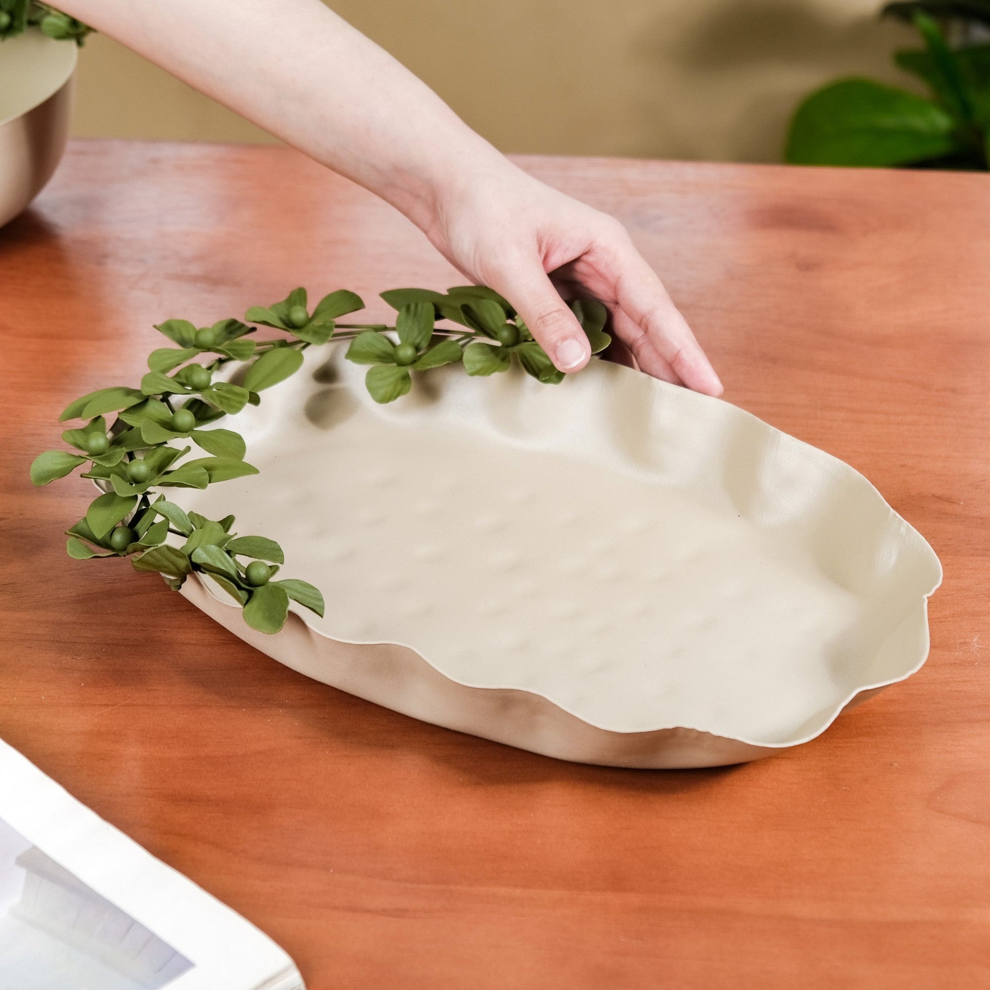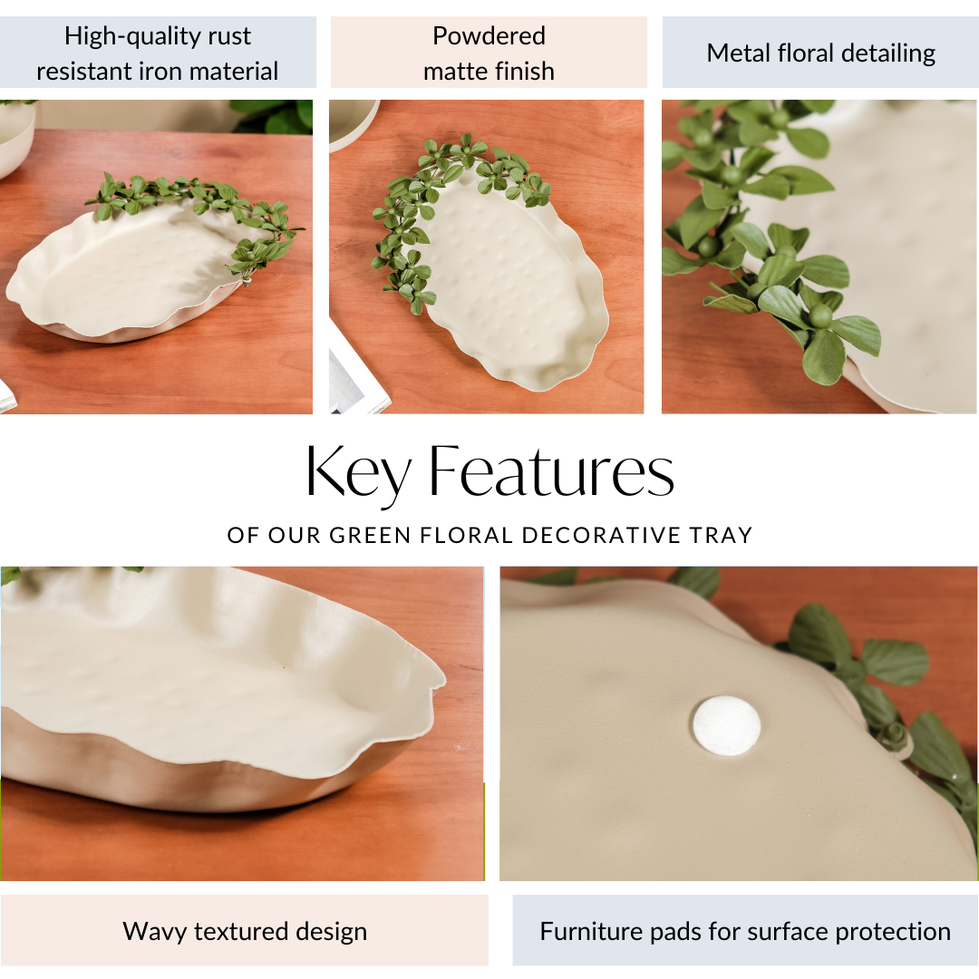 Elevate your decor with our stunning metal decorative tray. Crafted from high-quality, rust-resistant iron, it boasts a luxurious matte finish and intricate floral detailing, adding a touch of elegance to any space. The wavy texture enhances visual appeal, while foam furniture pads protect the surface. This tray is versatile and durable for displaying decorative items. Easy to clean and built to last, it's a stylish and practical addition to your home.